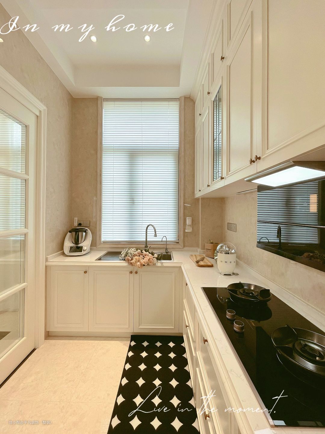 黑色的炉灶面和水槽巧妙地打破了白色的单调,形成了强烈的色彩对比。这种经典的黑白配色不仅凸显了厨房的功能性,更在细节中流露出时尚感与现代感。黑色的焦点设计,使得整个空间在视觉上更具层次感,令人印象深刻。 下方的白色柜子不仅增加了厨房的收纳功能,还以其简洁大方的设计和流畅的线条,进一步彰显了法式风格的精致与优雅。这些柜子不仅实用,而且美观,为厨房增添了一份温馨与舒适。