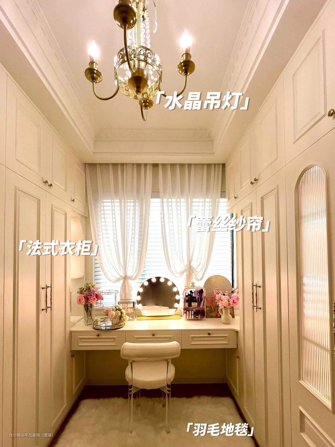 衣帽间以及其他衣柜都采用法式衣柜的风格,区别于的普通的平板门,采用极窄边框的轻法门型,混油奶白色门板配上古铜色拉手,长虹玻璃门提升空间的透气性和精致感。 背景墙的设计,以石膏线为主要元素,通过线条勾勒,提升了整体的法式氛围感,营造出一种浪漫而优雅的空间格调,石膏线的造型上,选择了法式的雕花风格,其精致的图案和流畅的线条,增添了背景墙的层次感和立体感,也使得整个空间更加富有法式氛围感。 优质的蕾丝纱,以其柔软顺滑的材质、良好的透光性,以及精致的刺绣和浪漫的荷叶边设计,为房间增添了一份柔美与浪漫。将其与布帘进行双层搭配,不仅丰富了层次感,还保证了室内的私密性,让窗外的风景若隐若现,为房间带来法式生活的优雅与浪漫氛围。