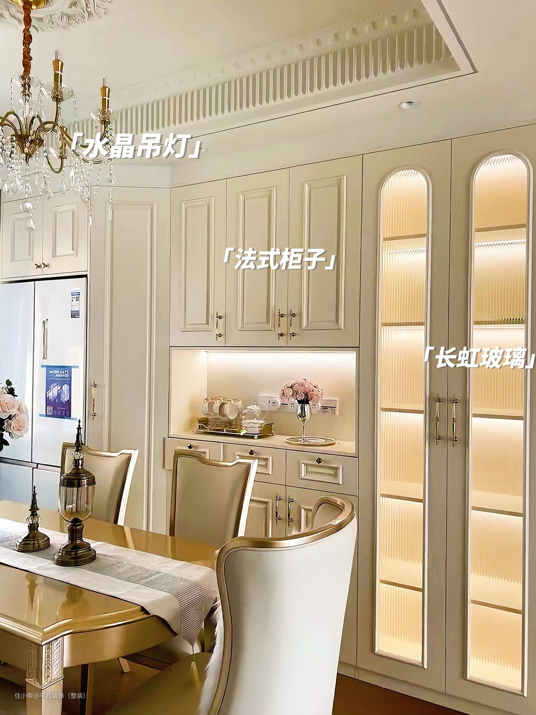 餐厅融合法式轻奢风格,餐厅右侧的白色橱柜简洁大方,提供了充足的储物空间,用于存放各种厨具和餐具。白色的柜体搭配金色的把手,彰显出法式轻奢风格的精致与奢华。 餐厅的吊灯设计精美,水晶灯饰闪烁着柔和的光芒,为整个空间增添了一抹奢华感。 桌椅的选择同样注重舒适与美观的结合,优雅的线条和柔和的色调为餐厅营造出一种温馨而浪漫的氛围。 这个餐厅通过细节设计和色彩搭配,营造出一种法式轻奢的氛围。它既注重实用性,又不失精致和奢华感。