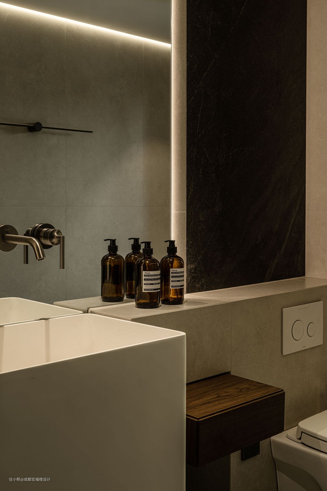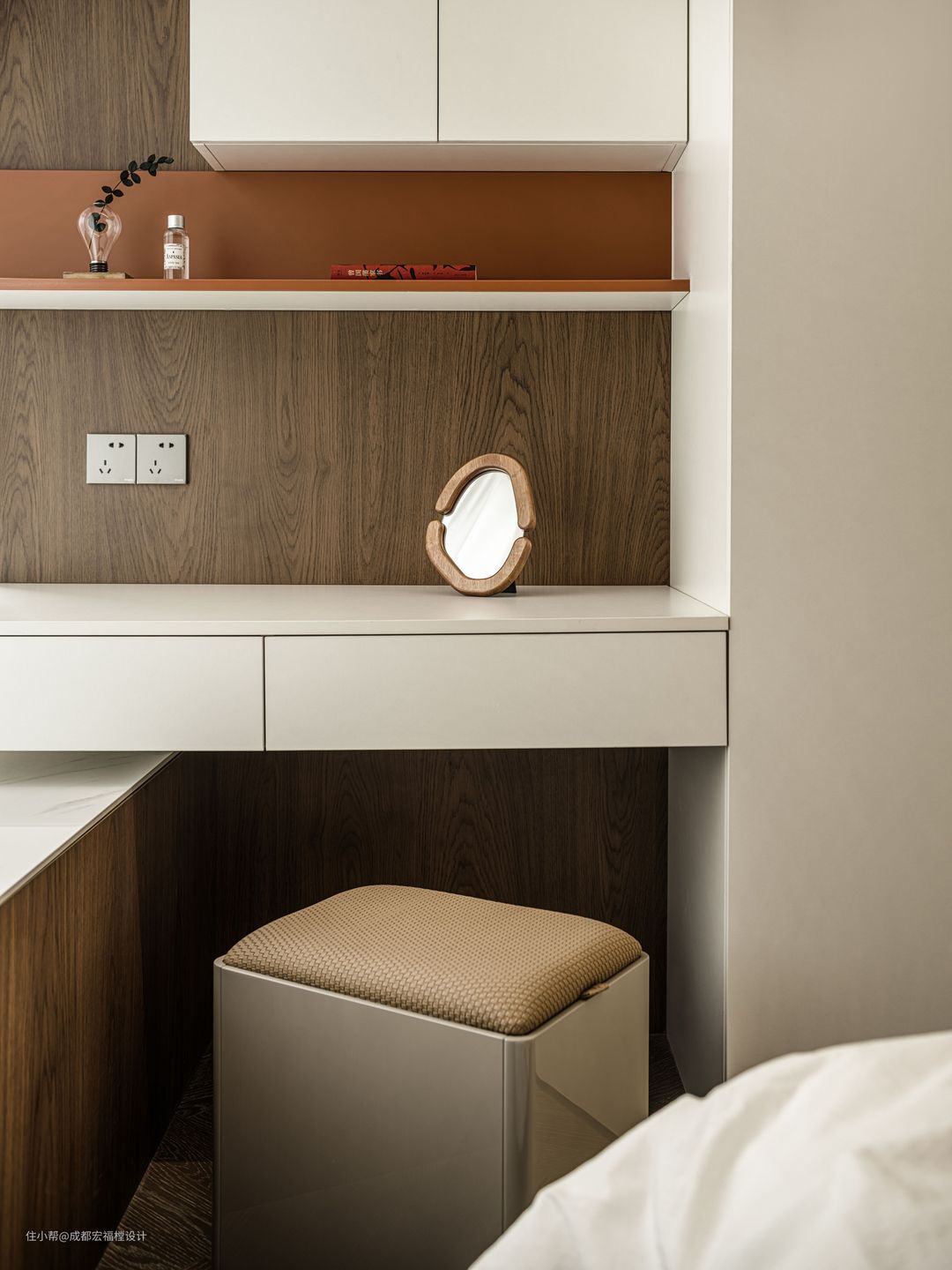 以最大化利用空间为设计考虑,调整床头方向,优化布局。利用飘窗搭建化妆台,加长桌面面积,并满足更充足的储物收纳。 材质搭配由公共区域来延展,表现为简洁有力的序列分割,让空间背景层次流畅、简洁轻盈。 卫生间干湿分离,以规整的形态融合一体盆、台面、马桶、镜面,赋予体量明晰的美学质感。玻璃隔断一反常态,选择清新纯净的苍兰黄,在自然光线的映射下,让室内绽放出勃勃生机,跳跃明媚。
