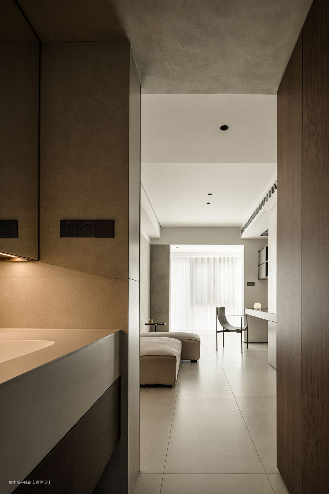 调整卫生间与家政阳台分布面积,干区释放于外部,便捷日常使用的同时拓宽走廊面积。胡桃木材统一包裹收纳柜体,巧妙的完整区域立面视觉,创造出连续性的连贯对话。