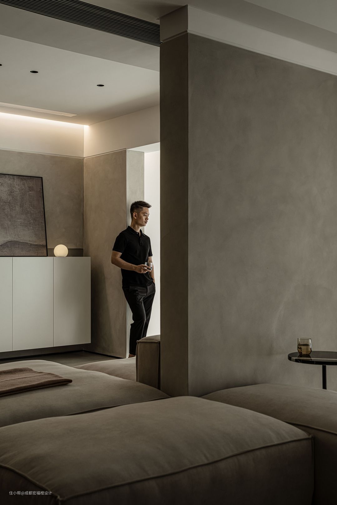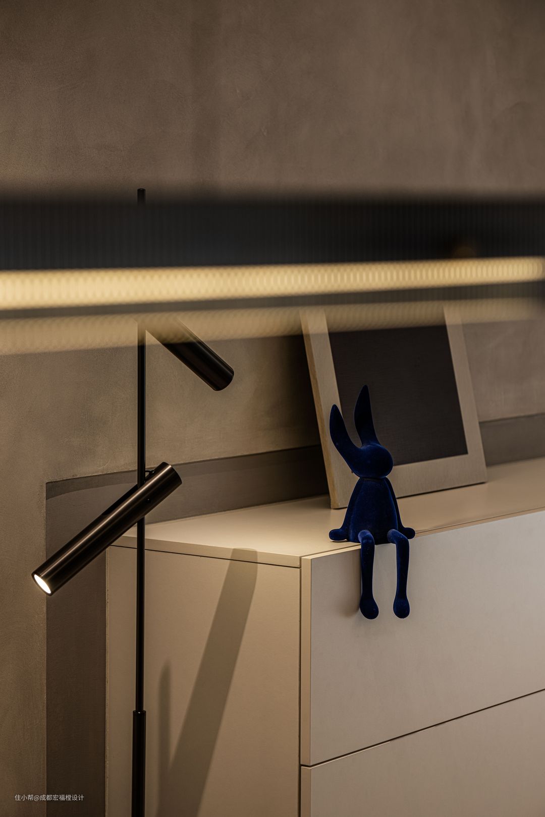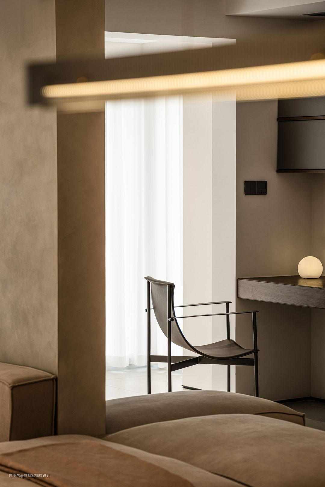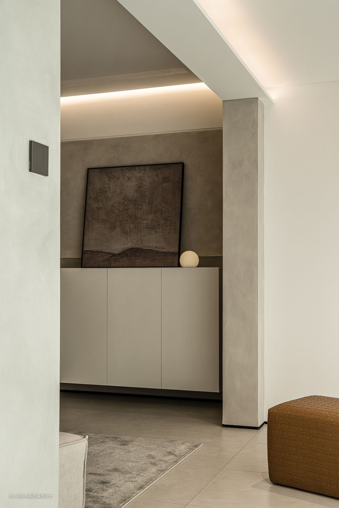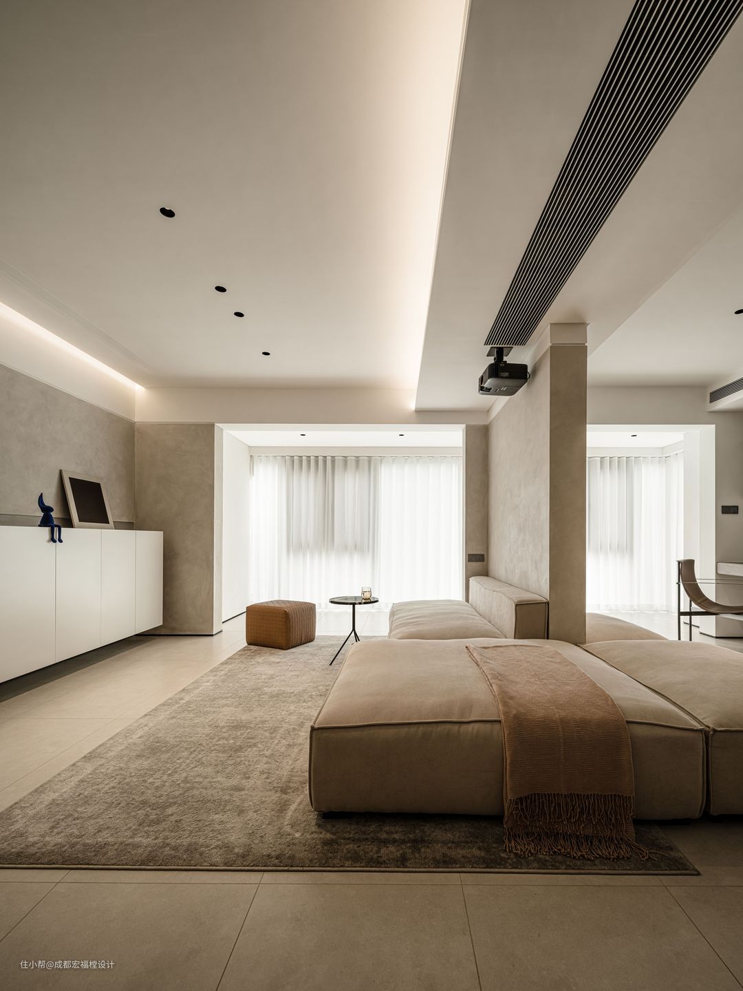 纳入景观阳台纳入扩充室内面积,同时拆除紧邻客厅的次卧(改造为开放式书房使用),公共区域形成完整、紧密、通透的交互关系,如获大平层格局体验。 空间以中性轻柔的浅沙色作为基调,安宁而惬意,带来温馨的舒适感受。墙面局部点缀灰色肌理艺术漆,一改传统平面装饰的刻板单调,层次视觉变化更显张力。 去繁至简,不同的几何体块构图强调整体视觉。投影幕布替代固定电视,悬浮储物空间灵活变为挂画、物件的陈设展示位置,调和出多元场景的体验价值,凸显人居于空间的主导作用。