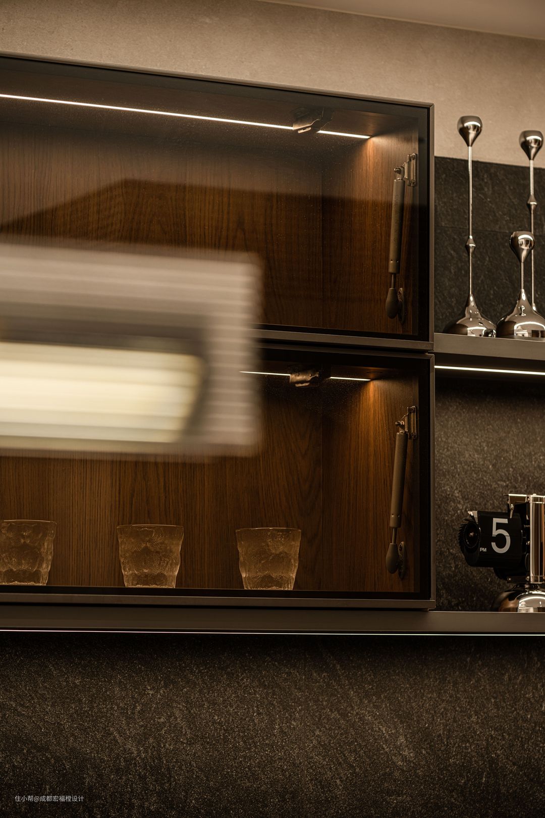 最大化利用空间,开放厨房与餐厅融合,并加入西厨功能,增强日常操作台面,完整最高效的搭配使用场景。优化细节,立面以岩板材质分割比例,玻璃、木材、金属材质多元展现储物方式,内嵌灯条,丰富层次视觉。与生活阳台衔接处设计通透灵活的玻璃折叠窗,满足通风与区域借光。