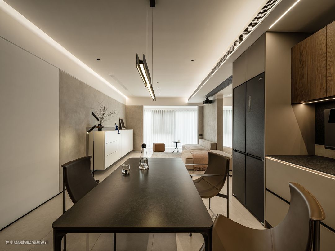 入户、厨房、餐厅视线完全释放,餐桌与西厨、中厨相互衔接,形成自由便捷的洄游动线。在富有极简意式的视觉质感之上融合现代氛围的明亮,呈现深邃含蓄的空间感受。不同光源投下柔和的光线,令用餐的时候情绪更加放松沉浸。