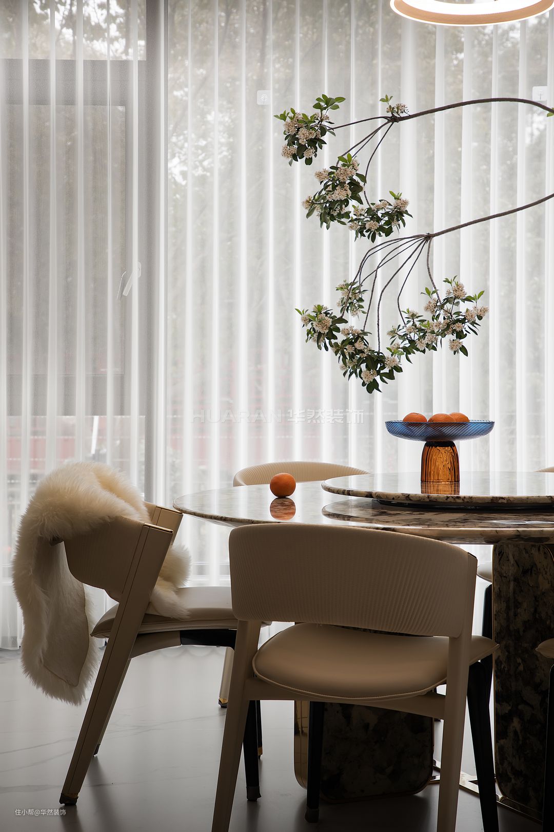 拾阶而上 来到的是餐厅和岛吧台空间 地面通铺岩板 花纹纹理自然延伸 细节处完全看不到铺设的缝隙 岛吧台用来做一些简餐 日常一家三口吃饭也都在这里 当家里有客人 这个专门定制的1.5米圆桌足足能容纳8-10人的用餐 案几上的海岛春花和室外景相调 呈现丝丝缕缕的禅意与静谧