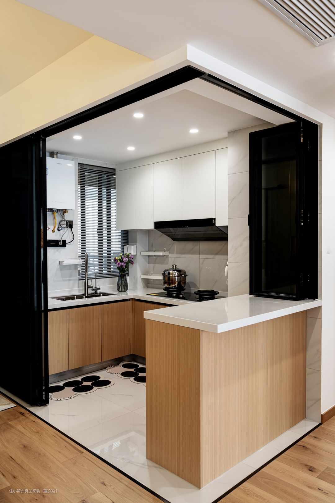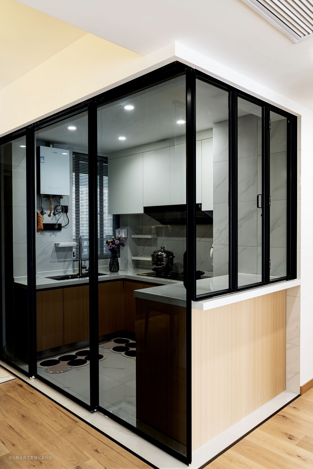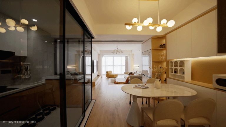 厨房墙体打通设计成了开放式布局,两面实墙以玻璃移门替代,一个全透明的“玻璃厨房”应运而生。 打开移门变成开放式厨房与客餐厅互通,关上移门则可阻隔烹饪时的油烟。