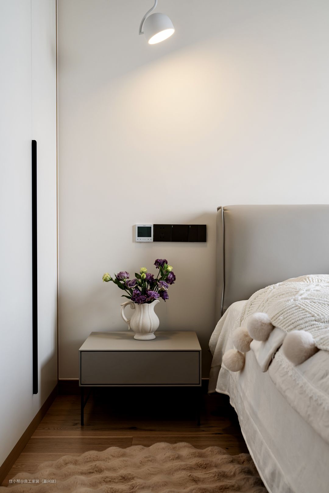 次卧空间选择了相对清浅的配色,淡淡的米灰色软包床搭配木质地板、纯白墙面,将静谧治愈的氛围烘托到了极致。