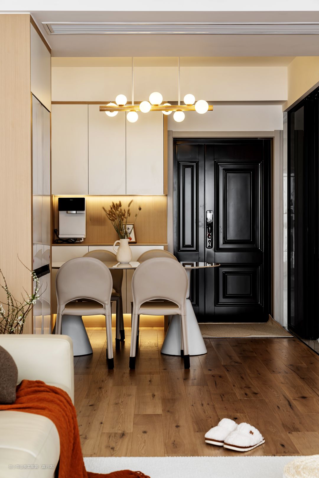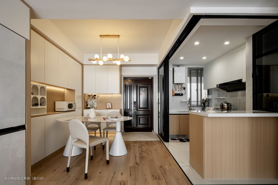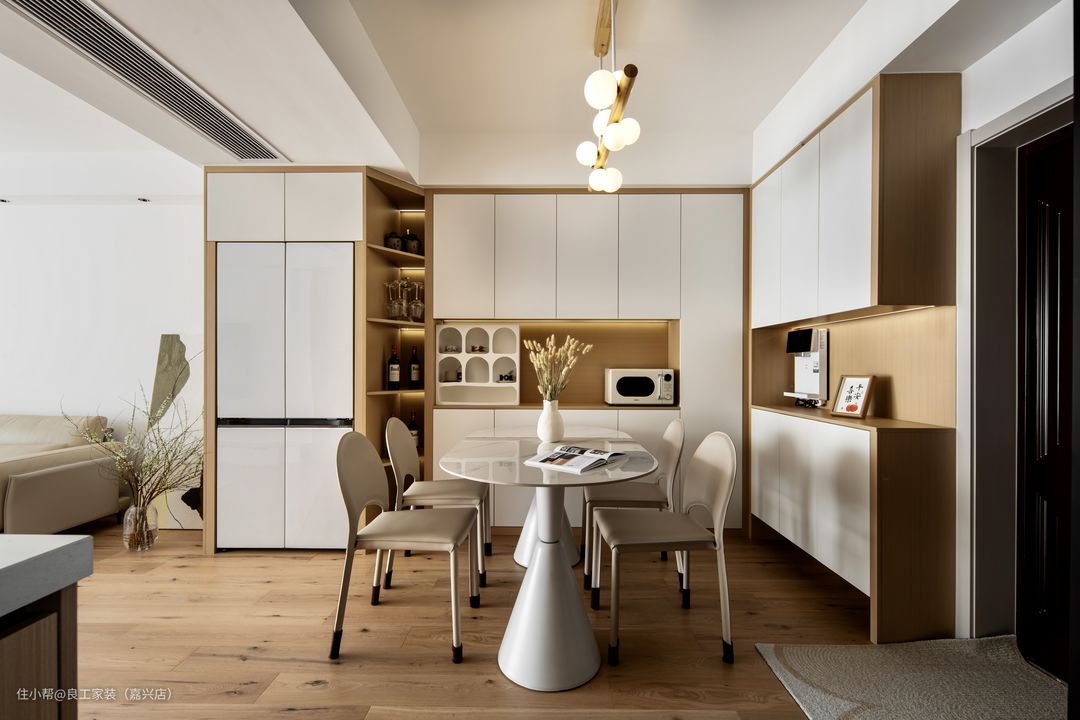 餐厅与客厅采用了互为开放的布局,带来敞亮的空间视觉感。 运用全屋定制充分运用墙面空间,打造出了超充裕的餐厨收纳系统,既与玄关柜融为一体,也将冰箱嵌入其中,轻松应对多元化生活场景所需。