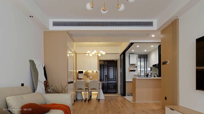 入户即可感受到开放式的客餐厅开阔自由,奶油色墙漆自带的温柔质感足以展现家的清简温馨。局部融入原木元素,治愈感更为浓郁。 全屋通铺原木质地的地板,实木本身的天然纹理自带原始气韵, 不仅增减了空间的细节精致感,也奠定了空间温雅的基调。