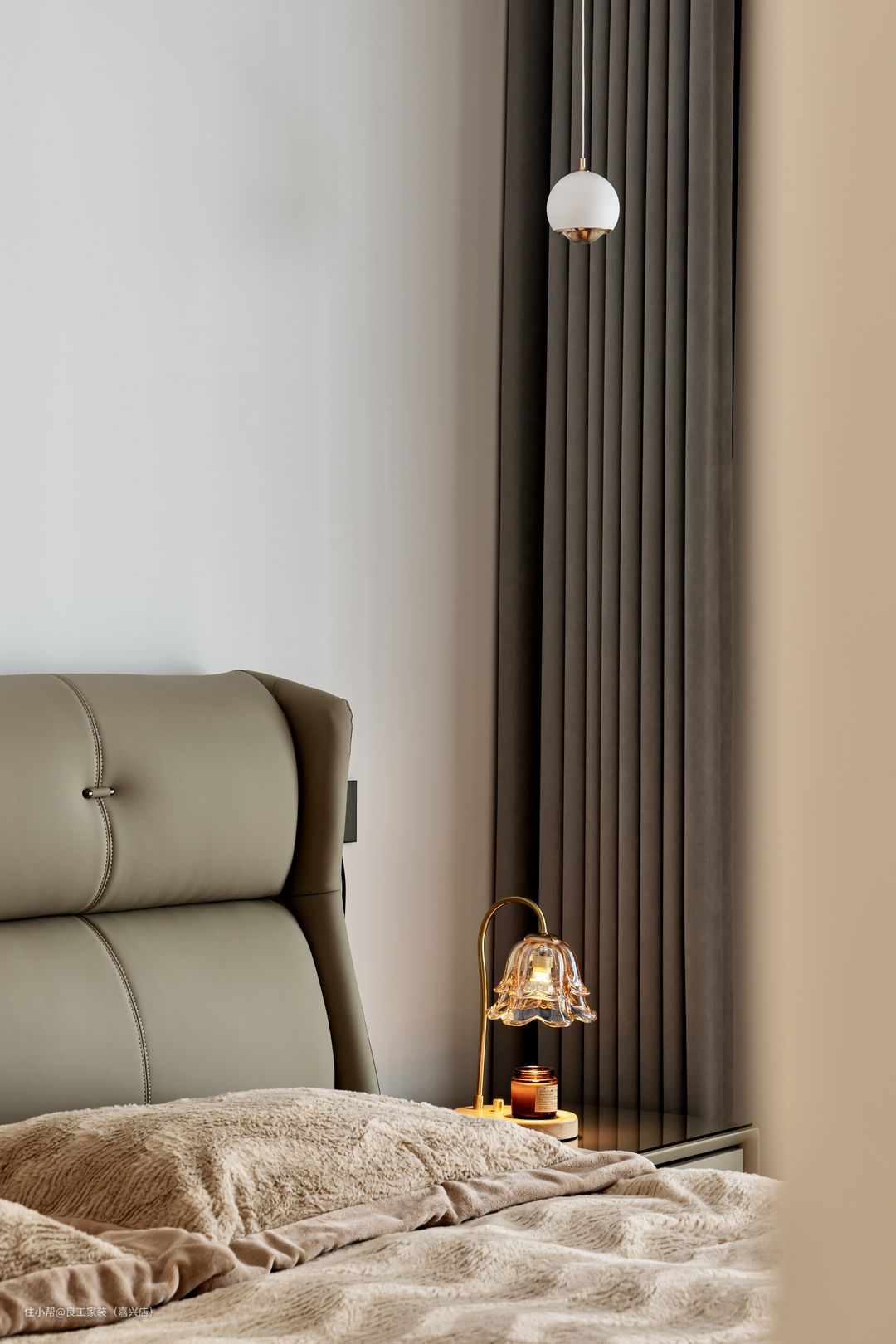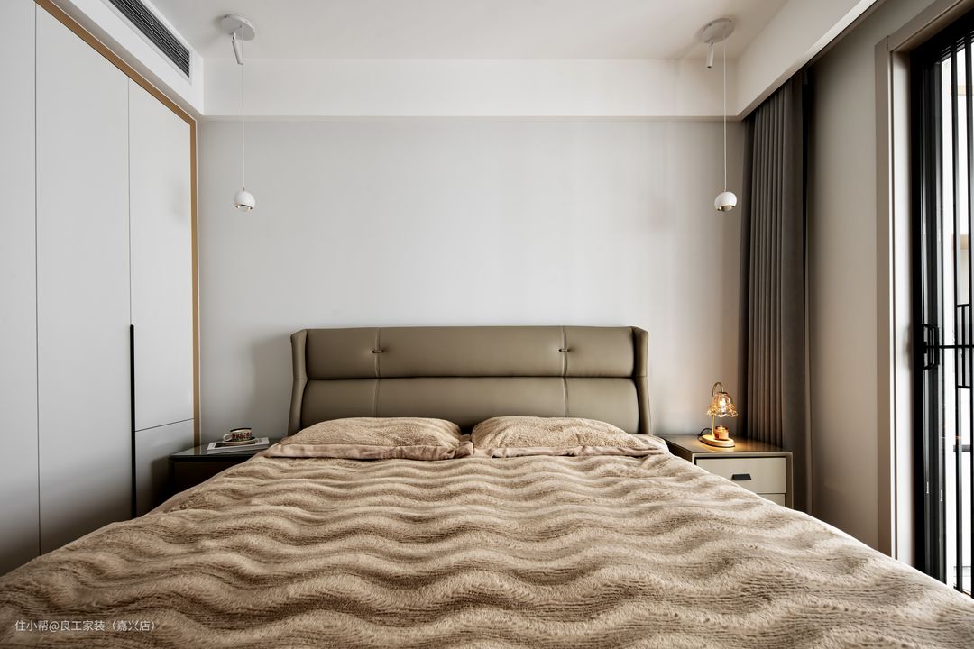 主卧选用奶咖色皮床搭配同色系床头柜,以家具材质与配色定位空间温度,打造沉浸式休憩空间。