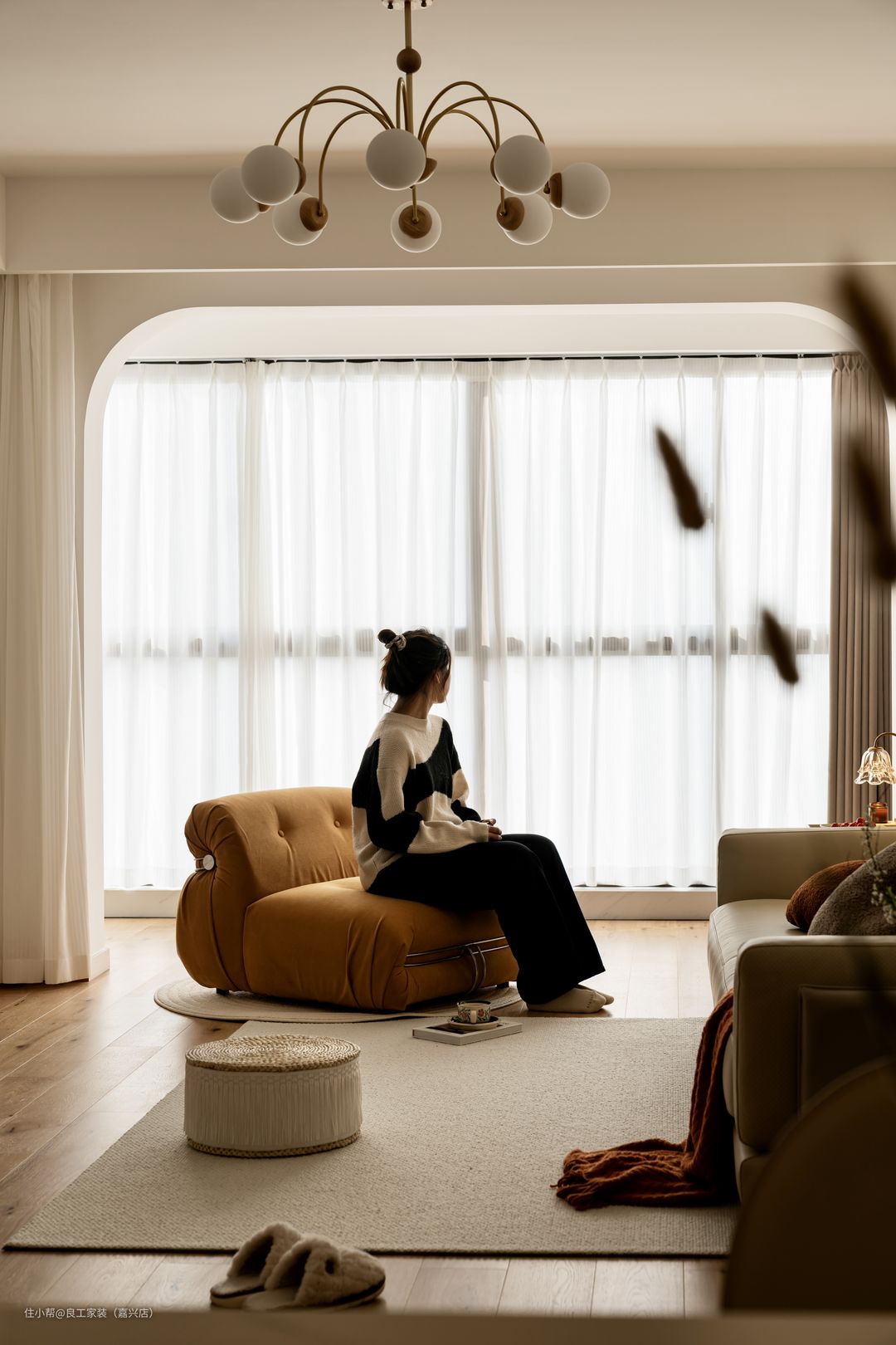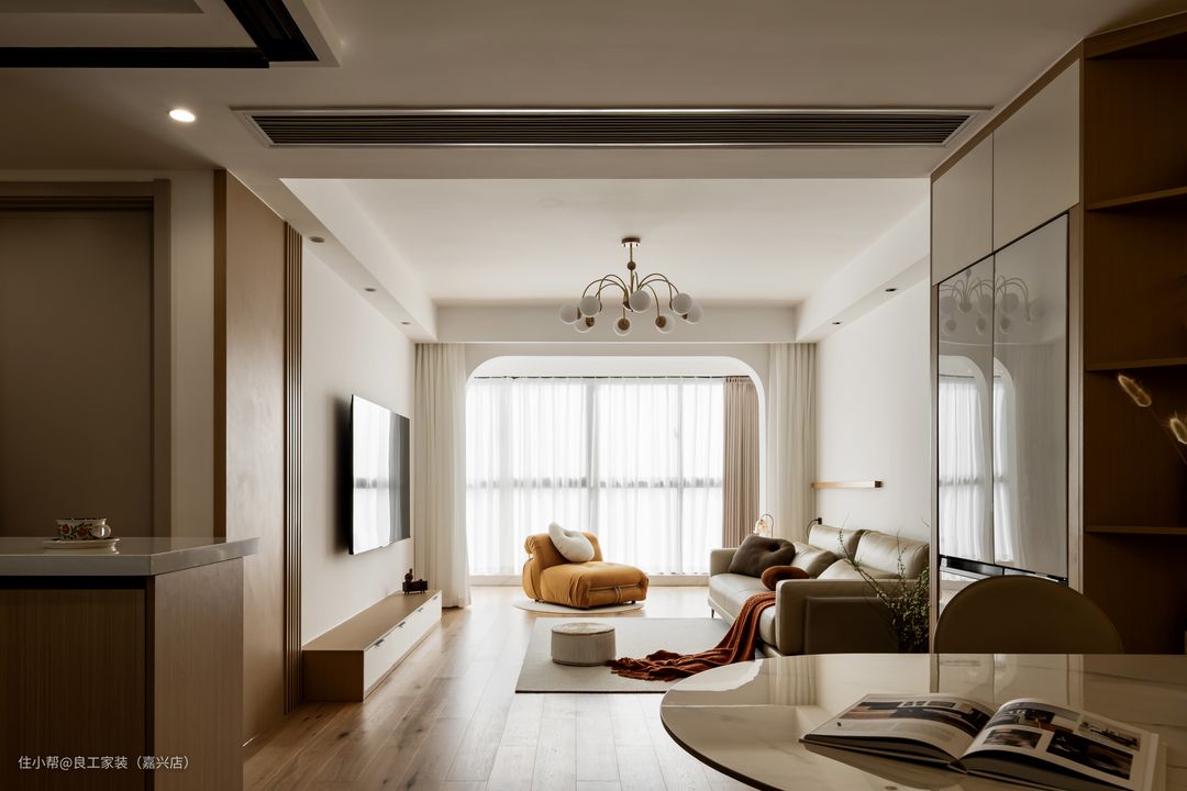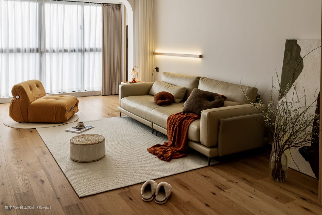 看似简简单单的每一件单品,都经过精心甄选搭配,同时存在于温柔的空间里,形成了独有的节奏韵律,给足了居住仪式感,点缀了一室氛围感。 阳台与客厅以拱门隔开,视线沿着弧线过渡,自然光影透过纱帘挥洒入室,让起居空间自带温柔滤镜。