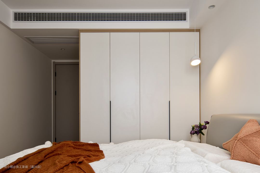 一侧定制高柜,到顶的柜体设计释放出大容量储物空间,方便屋主日常衣物收纳。