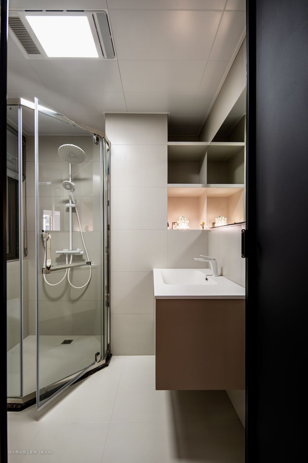 卫生间结合屋主家庭目前生活状态,让设计更加人性化。悬浮式洗漱台更显轻盈视觉,也便于日常清洁打扫。墙体一侧上方增设壁龛式收纳格,缓解卫生间置物压力。