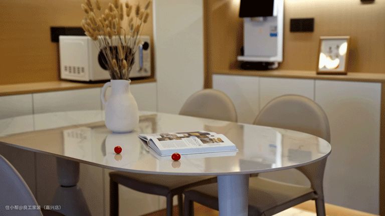 选用椭圆造型的岩板餐桌,结合浅奶咖的弧面靠背餐椅,将就餐时光包裹于实实在在的小资氛围当中。
