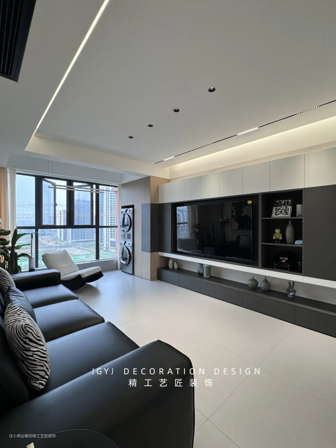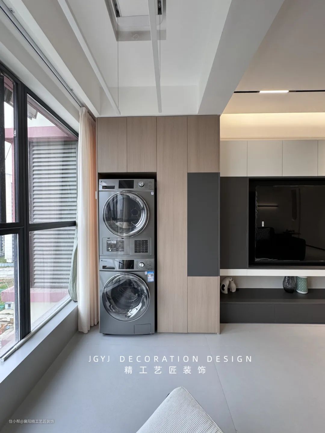 阳台区域还配备了洗衣机柜,可将洗衣液,衣架等日用品分区收纳,既美观又实用。阳台上方则安装了嵌入式电动衣架,有效利用了空间,使客厅整体看起来更加整洁和统一。