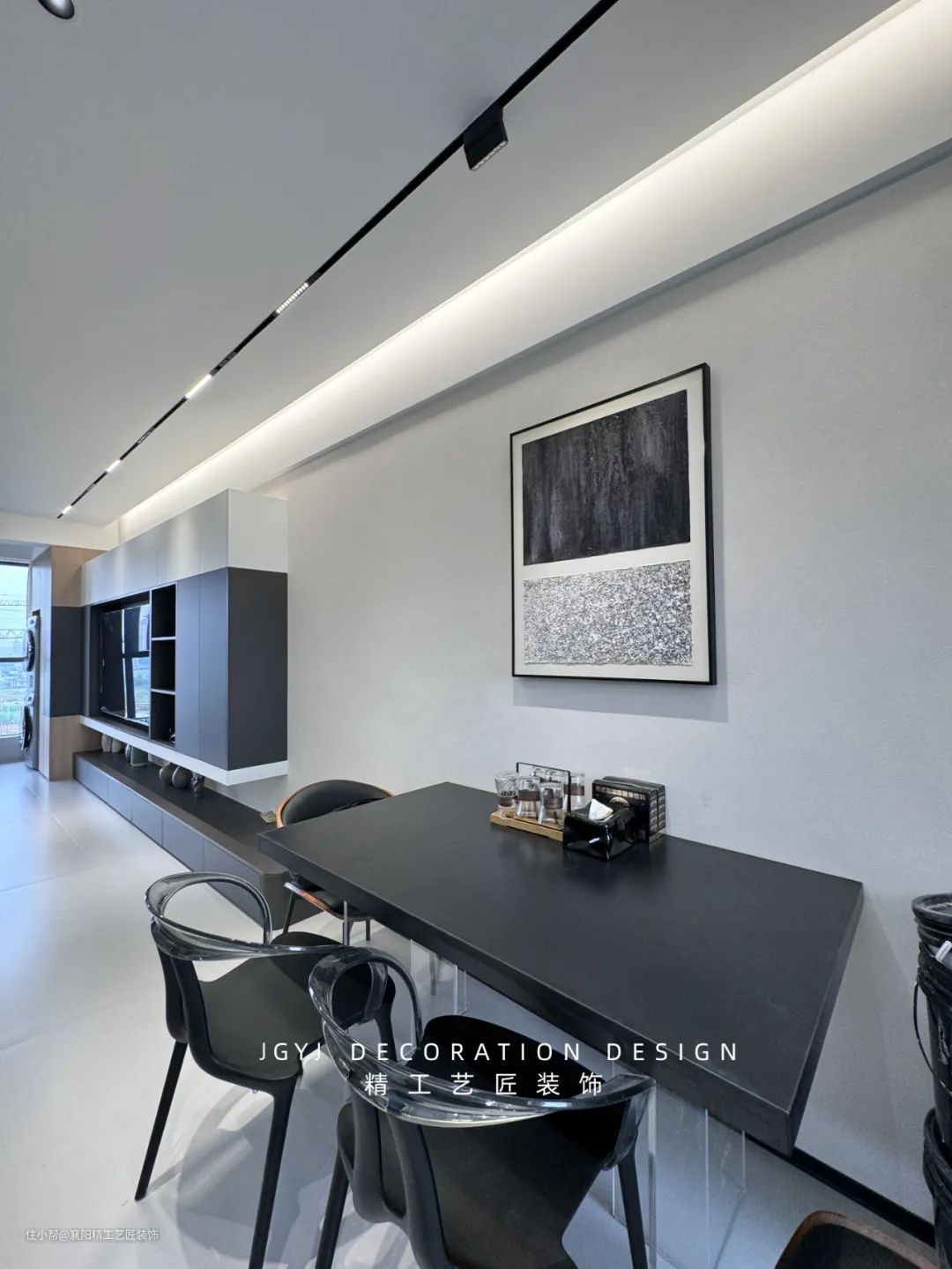 整个用餐区域主要突出了舒适性,黑色的桌椅拼接透明材质简约有质感,并且靠墙摆放,扩大了用餐区域,为使用者营造了一个舒适的用餐环境。头顶的射灯洒下柔和的光线,使得整个用餐区的氛围更加和谐温馨。