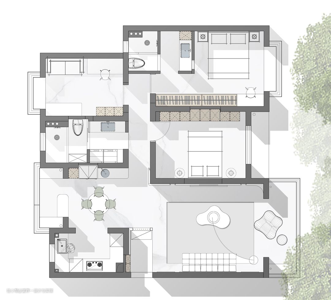开放式厨房让空间更显立体感,采光更通透亮堂;合理的动线:洗-切-炒-盛,使用起来幸福指数up!up! 橱柜满足各种收纳,多做抽屉,拿取方便;无把手设计整体感更强,更显干净简洁。
