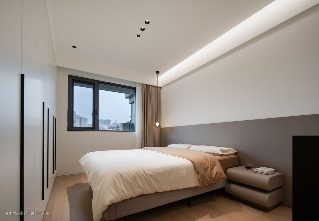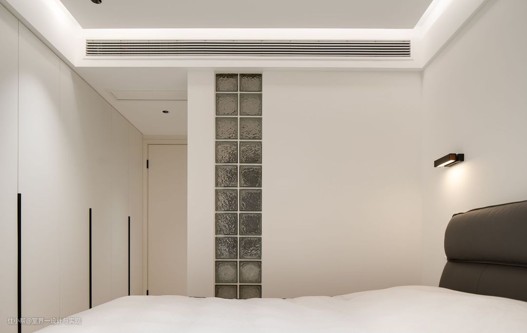半墙式假出床头,全屋定制护墙板,用护墙板做床头,比乳胶漆墙面更好打理,空间更加通透。 衣柜一门到顶,极简拉手高级感满满,实用性也是非常的nice!