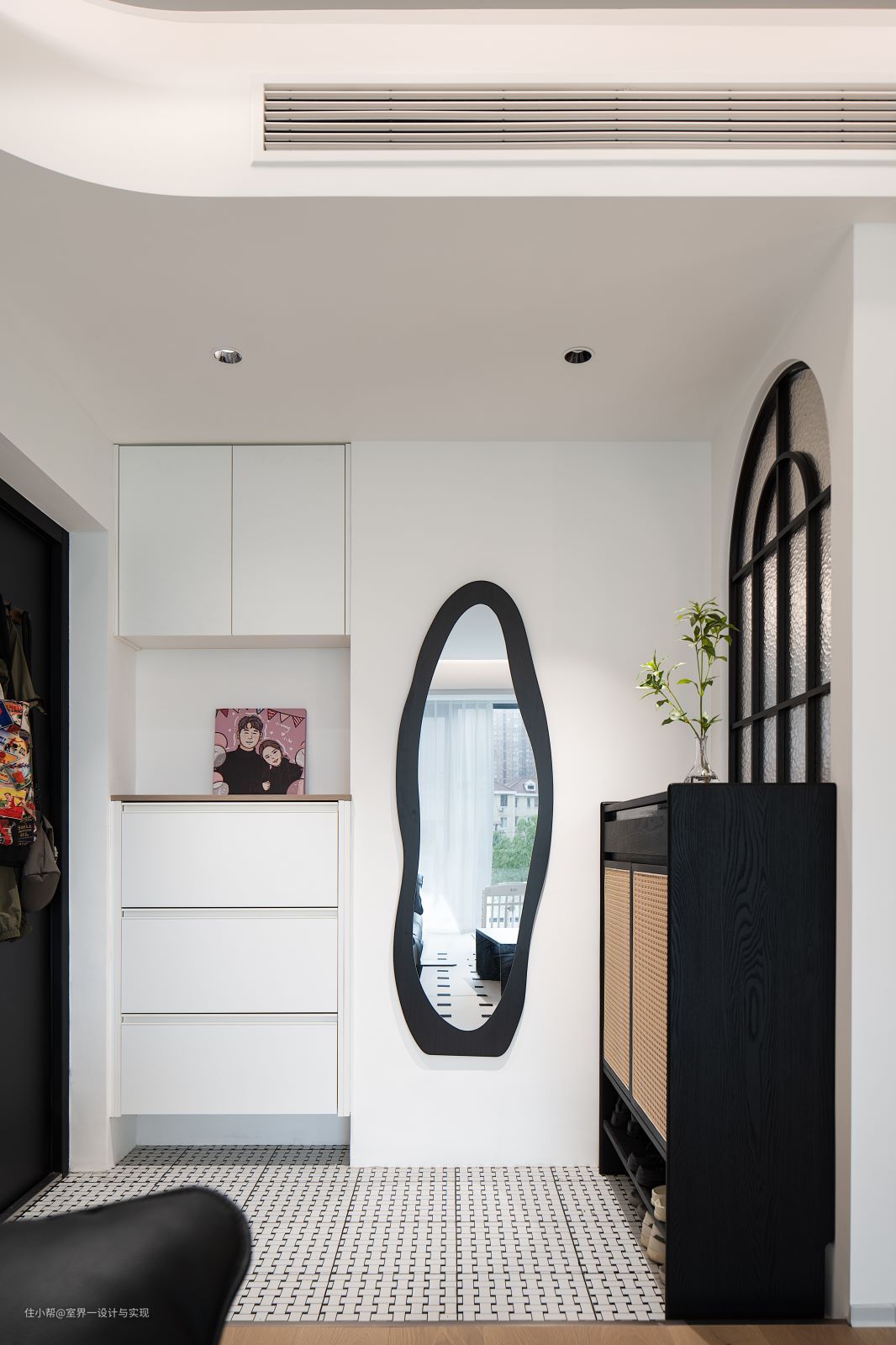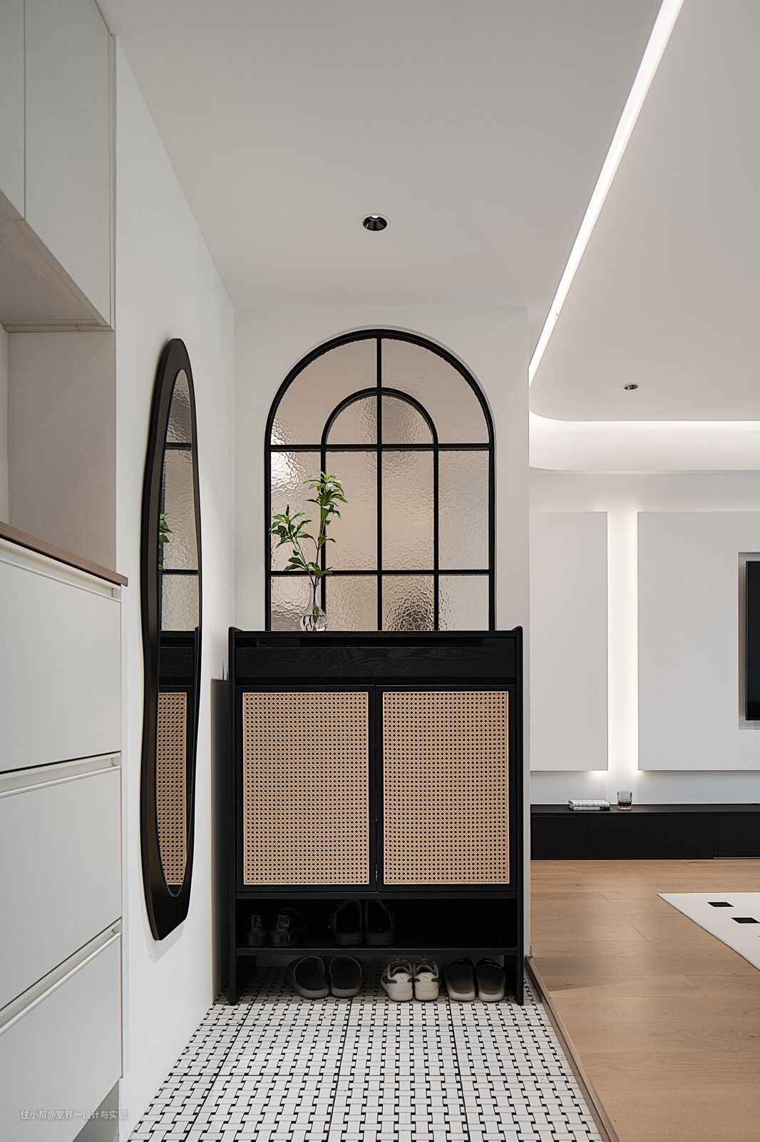 入户左侧玄关柜合理划分区域,中部和底部留空,穿插格栅设计,方便生活收纳,柜体更加轻盈。 每一个爱美的女生都爱照镜子吧,出门前的整体穿搭效果怎能不安排妥当呢~