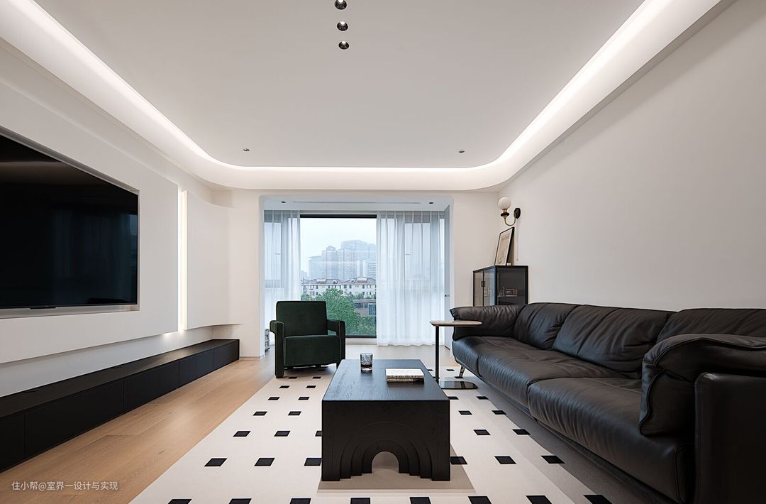 黑色长方形桌案,以其稳重的姿态,成为客厅的视觉焦点,更巧妙地划分了空间,使得各个功能区域既相互独立又紧密相连。 黑色大屏幕电视悬挂于墙面,巧妙地将现代科技融入,以其简约的外观设计,与整个空间风格相得益彰。下方的黑色低柜,则巧妙地隐藏了不必要的杂乱,使得整个空间更加整洁有序。