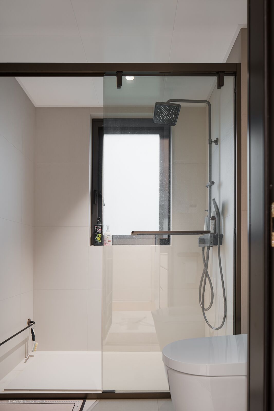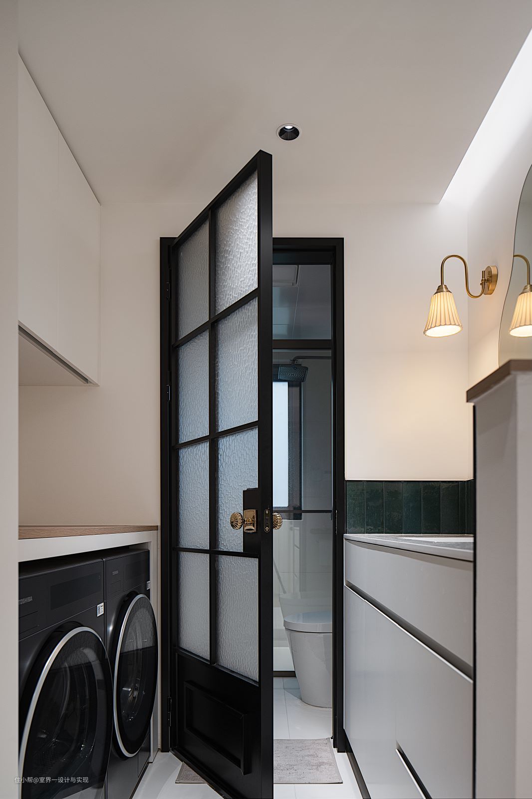 半墙式干湿分离设计,空间感更通透!淋浴区与马桶区采用玻璃隔断,既不影响采光,也很好的做了分区,高效节约时间! 清爽洗漱区,让你每天都能享受SPA般的洗浴体验;对面上空沿墙做储物柜,下方嵌入式洗烘一体,视觉面积得以扩充。