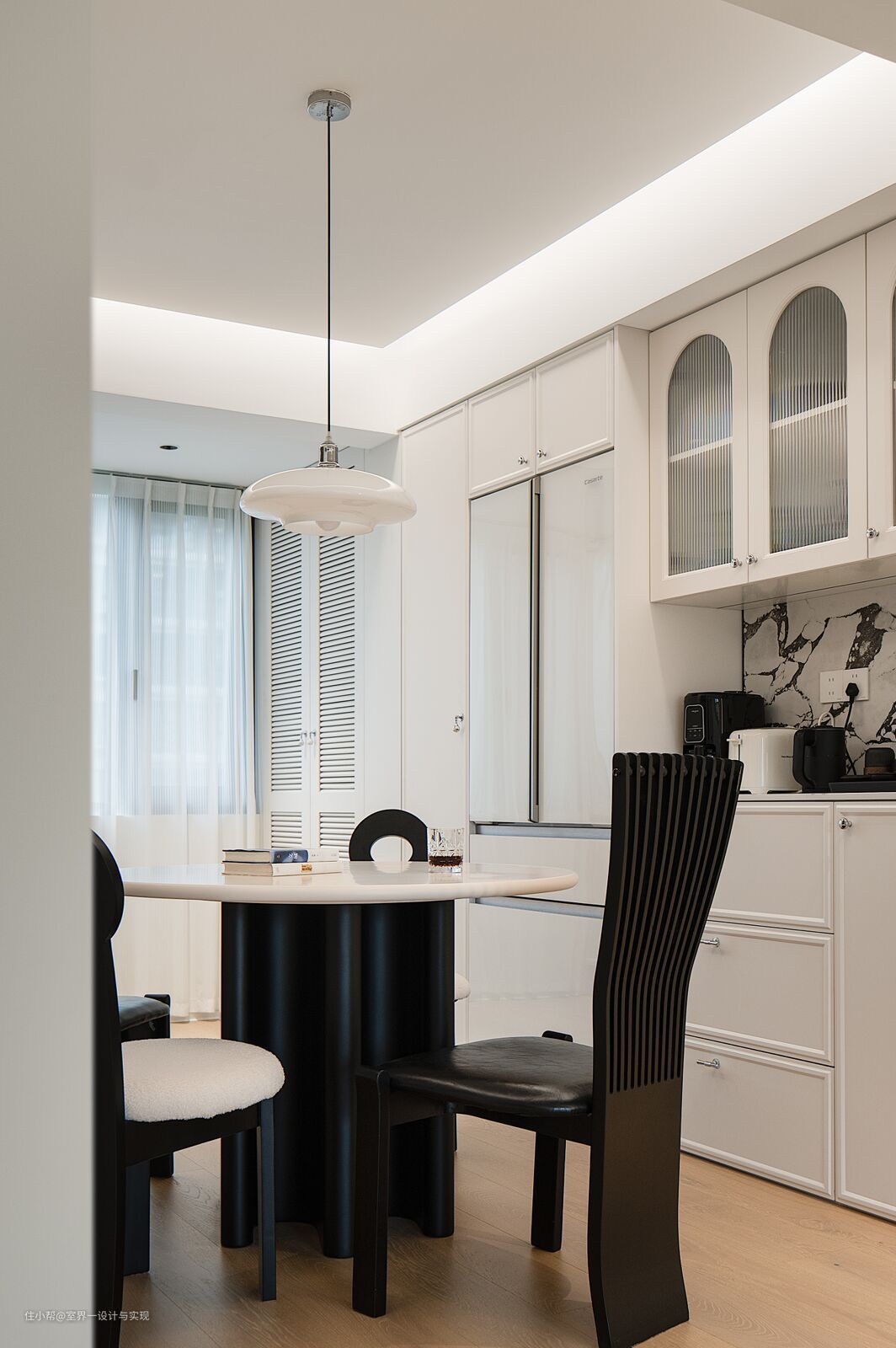 法式圆桌+索奈特靠背椅,简单的布局,就足够法式浪漫~ 餐边柜的回字形线条流畅简约,透露出一种法式独特的优雅气质。中部留空嵌入式冰箱,整体轻盈雅致!