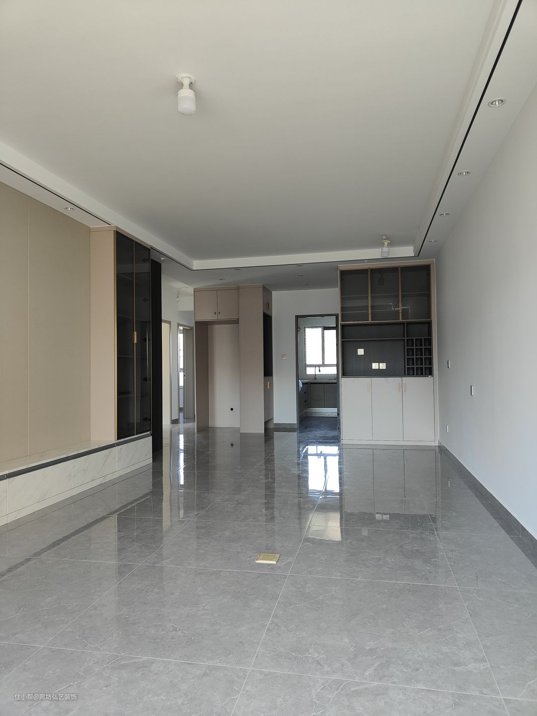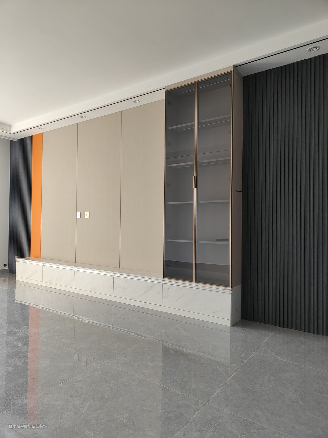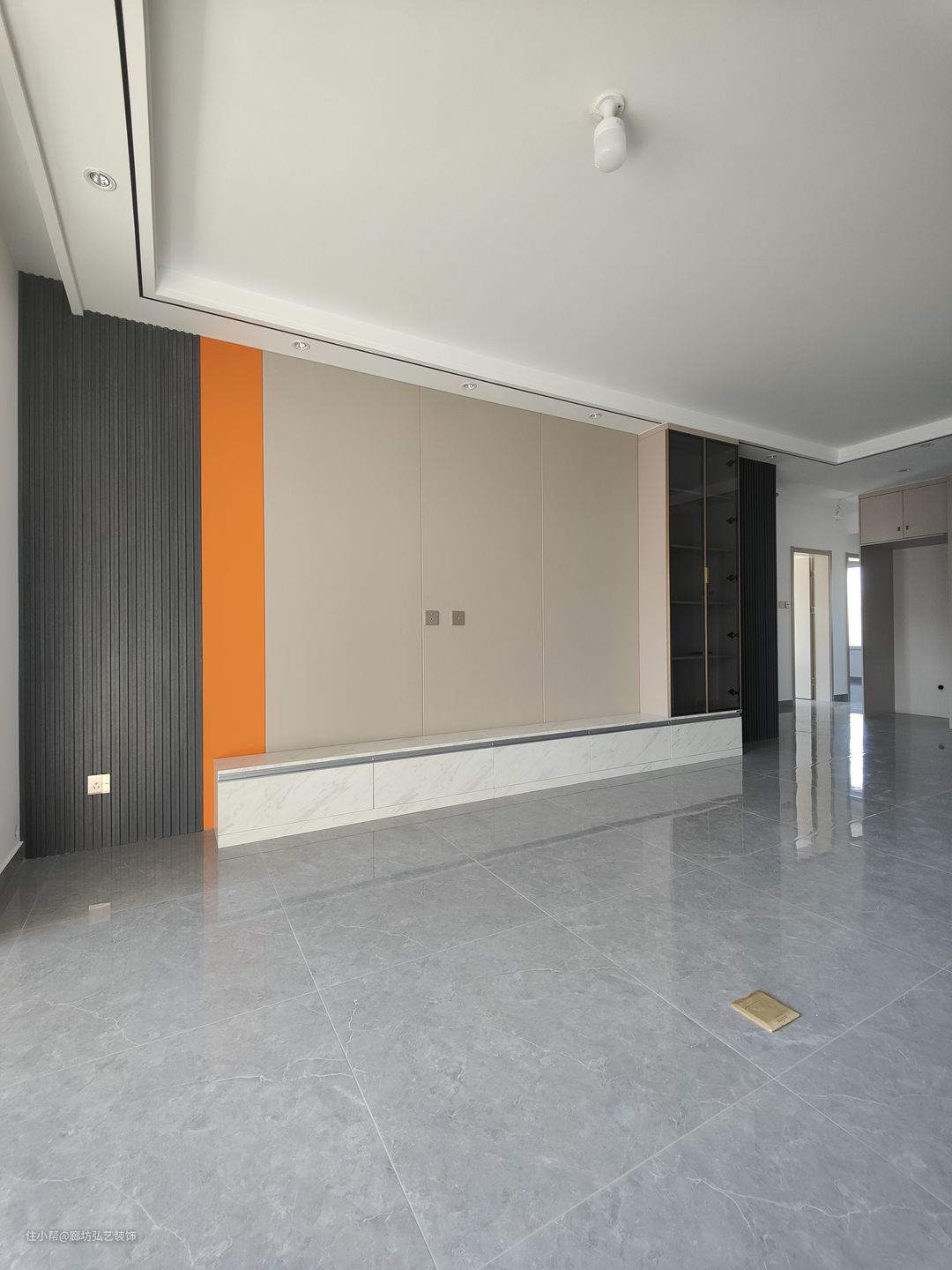 客厅一圈边吊加筒灯,为了迎合卧室门电视别景墙用的木格栅做隐形门设计