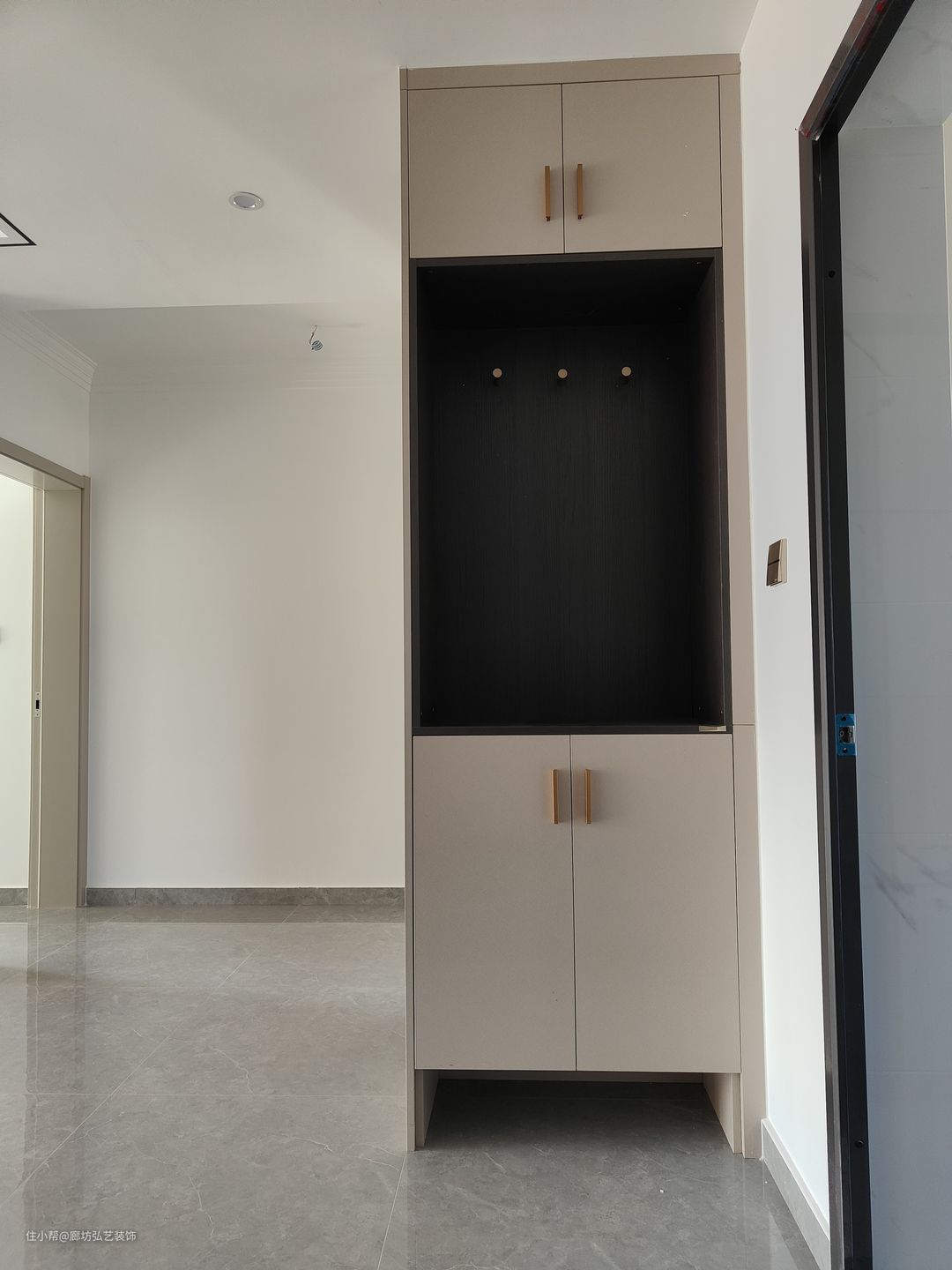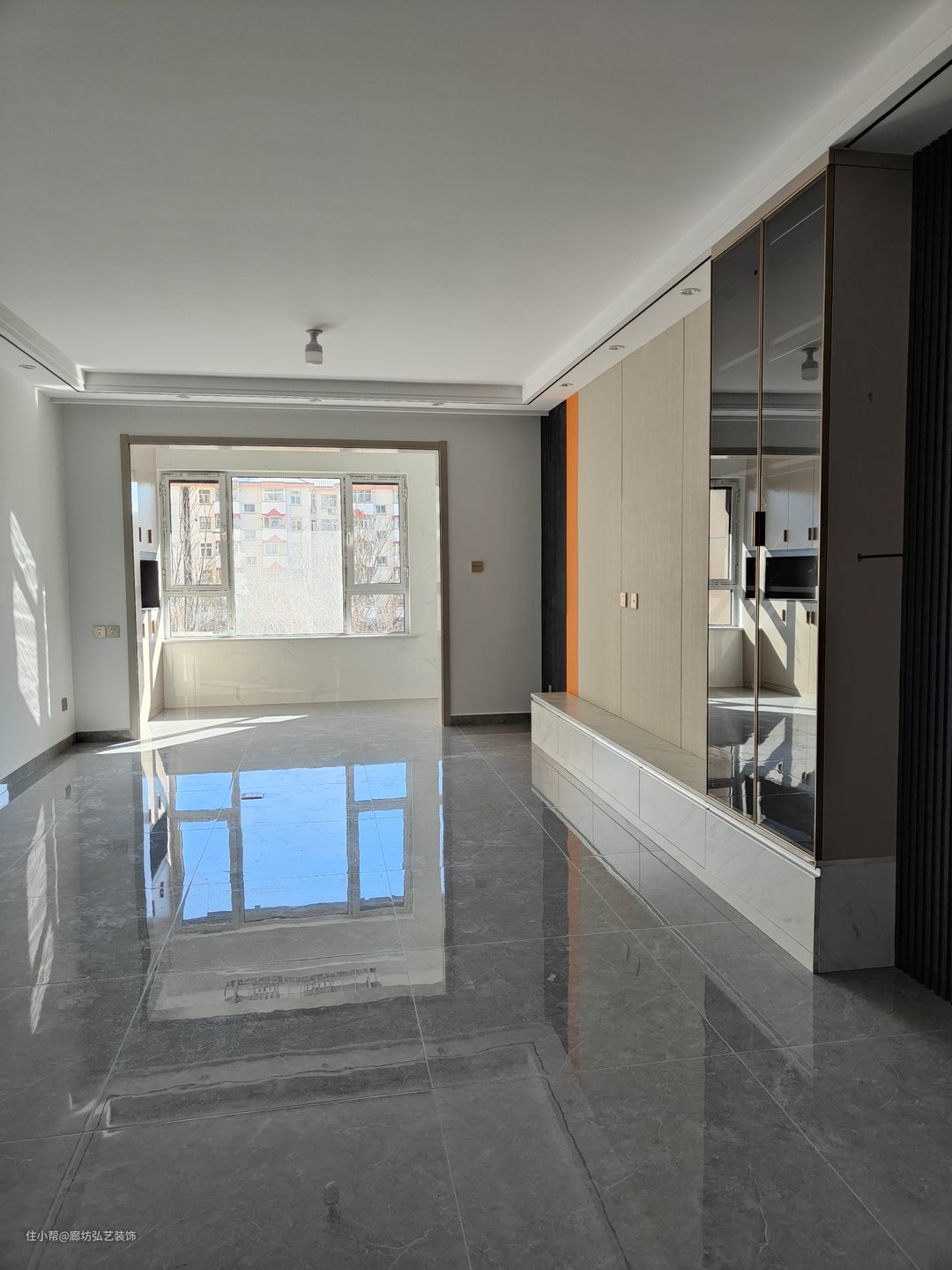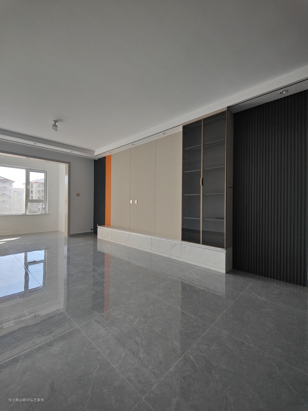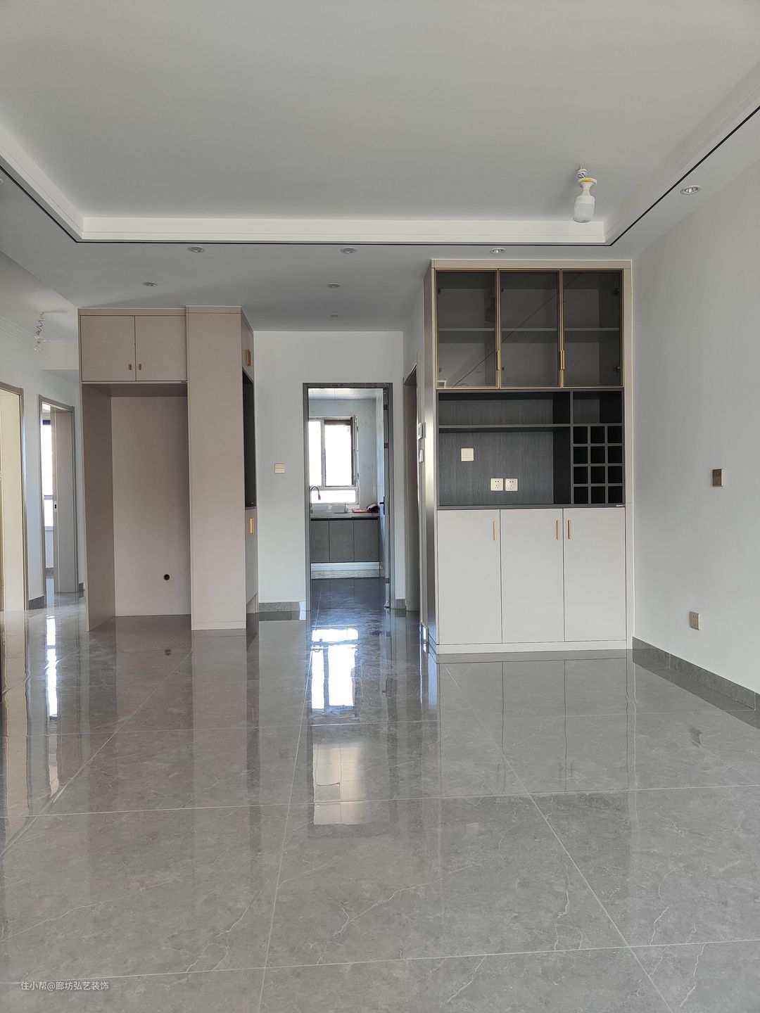客厅一圈边吊加筒灯,为了迎合卧室门电视别景墙用的木格栅做隐形门设计