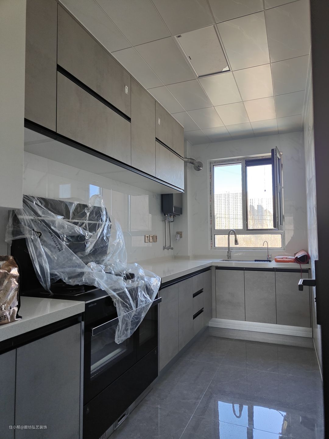 厨房L型,整排的吊柜和地柜可以收纳更多食物。