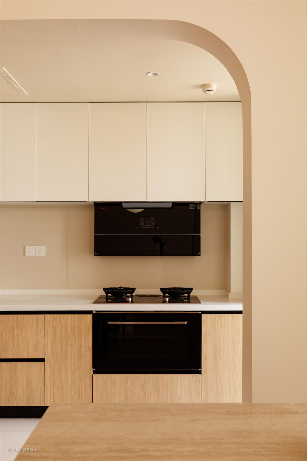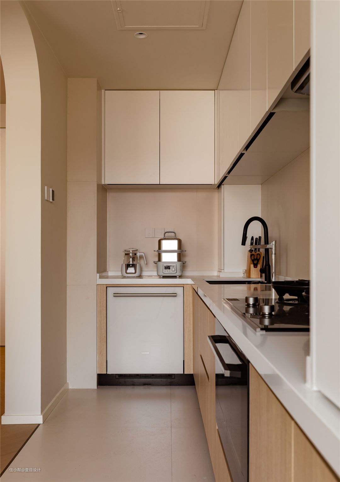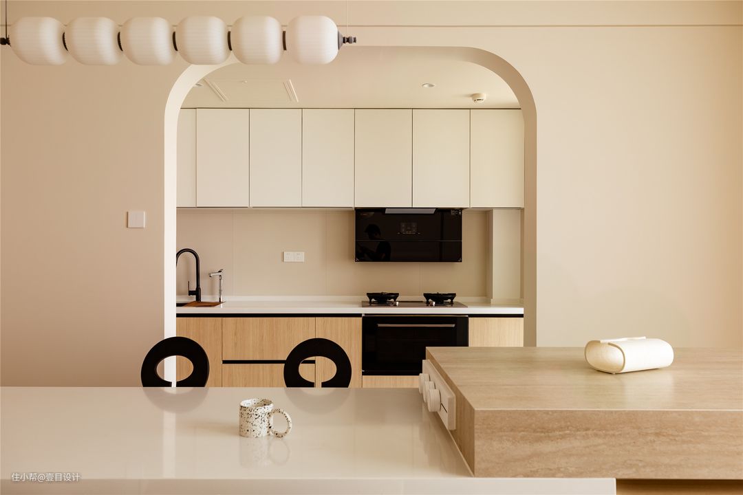 再次出现的拱门,毫不费力的完成了厨房由封闭向开放的转换,悄然模糊空间与空间的边界,让家一眼到顶的通透,厨房不再囿于采光不足,重拾明亮空间感,成为女主人大展厨艺的烹饪舞台。 厨房拓展入套内阳台,分担大体积冰箱的存放任务,空间更专注于舒适下厨体验的塑造。L型操作台面遵循洗、切、煮的环节有序展开,下厨效率事半功倍。 橱柜沿用经典的木白配色,将温柔感贯彻到底,素净的灰色地砖,则更多考虑耐脏与实用性。