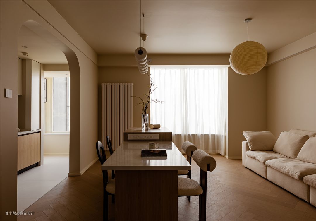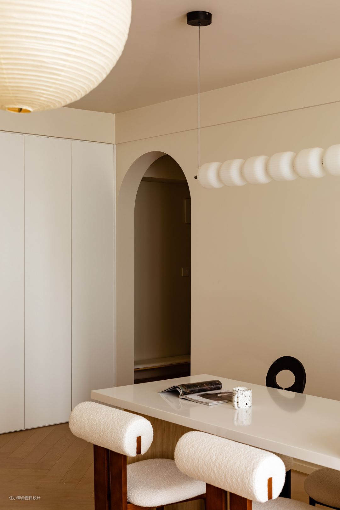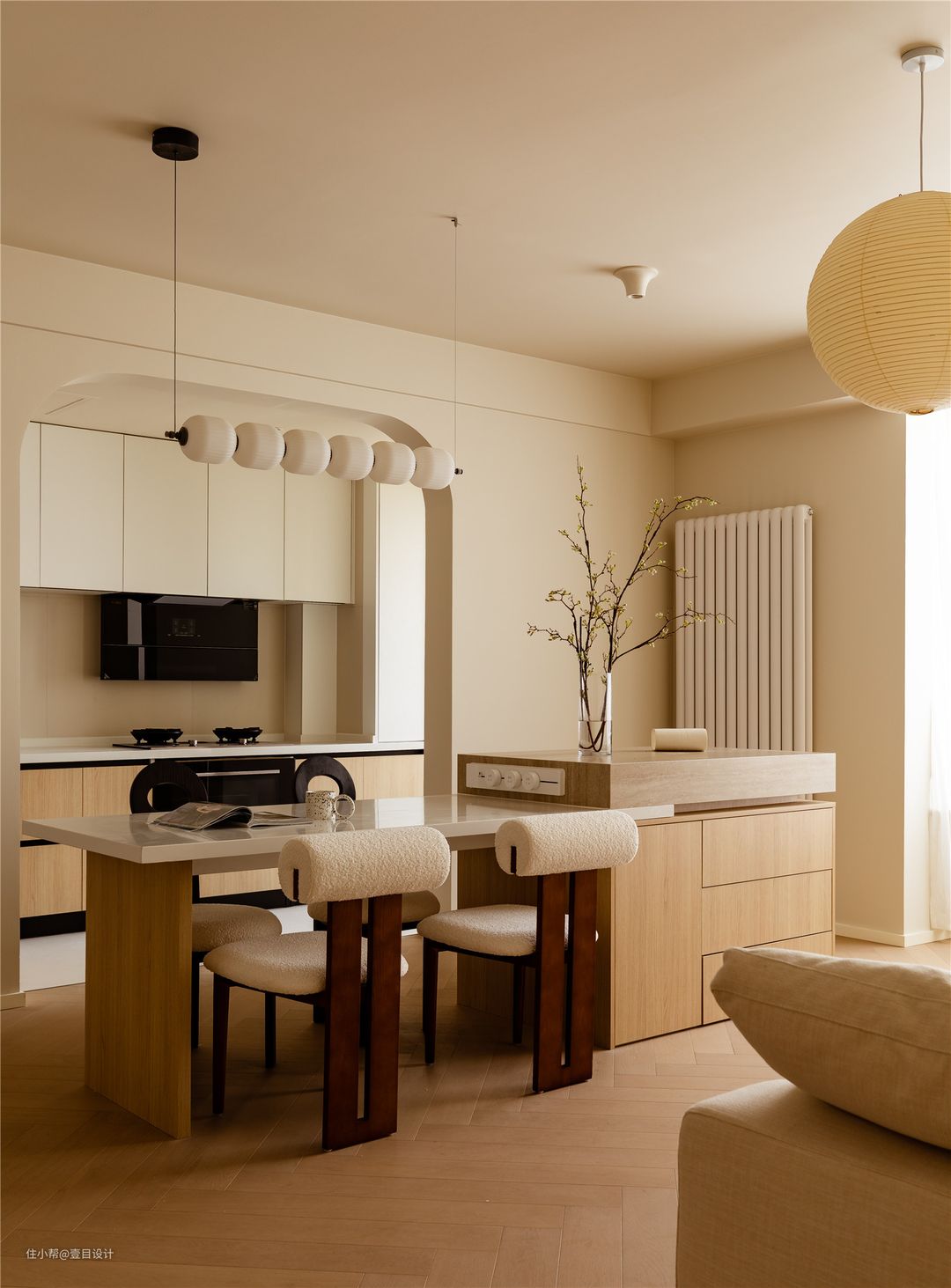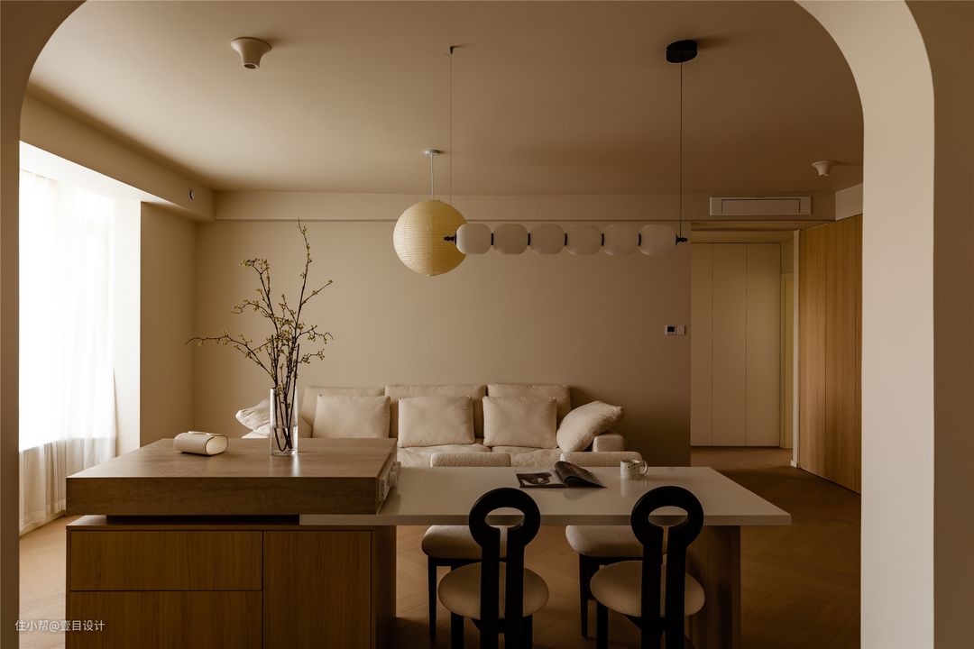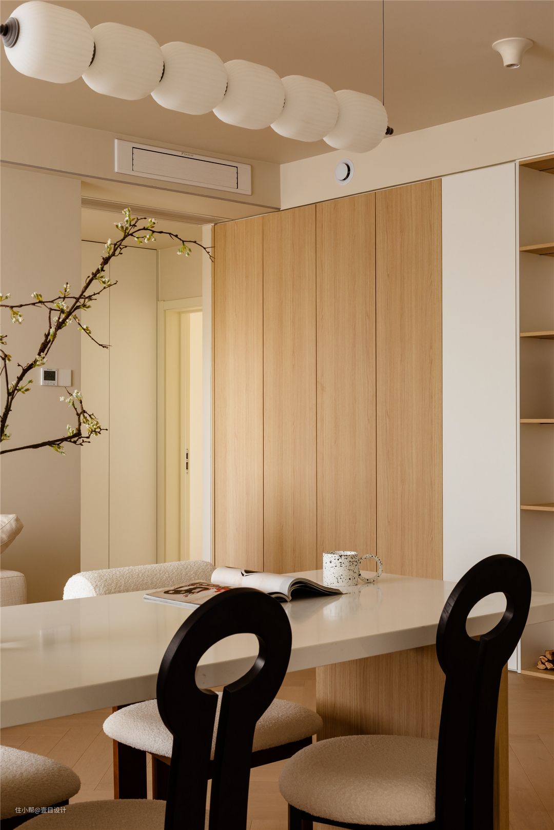 伴随厨房的开放,餐厅成为链接客厅与厨房的枢纽,开敞的LDK格局,建立起交互式的空间关系,增进家人的情感互动与交流,由客厅看向餐厨的视线,也有层次的递进,形成视觉空间的延伸,成就通透开阔的公区。餐岛一体的设计,除用餐之外,阅读、收纳和烘焙等更多场景在此交汇,衍生出丰富的生活体验。 米色洞石岩板岛台与白色岩板长桌,高低错落衔接,下方的支撑腿与储物柜,则以温润的木质呈现,不同色彩、材质与肌理碰撞对比又相互调和,达成空间的美学艺术平衡。