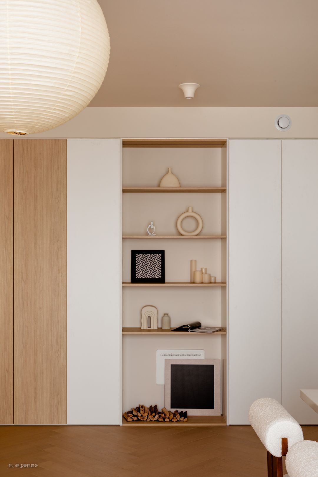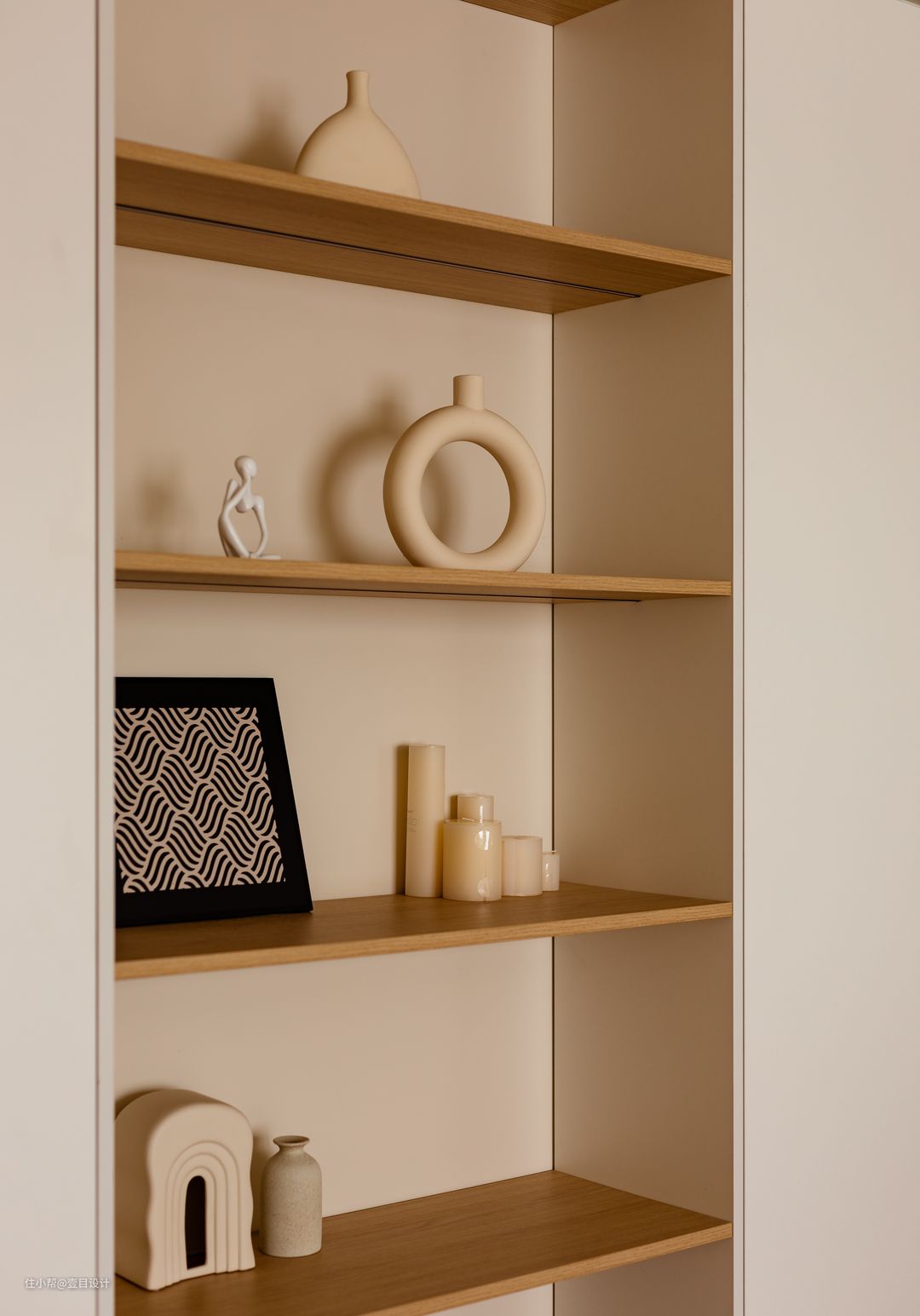 藏露结合的走廊满墙柜,集美感展示与功能实用为一体。一门到顶柜以木白柜门穿插的形式呈现,弱化平庸单调。质地温润的香薰、瓷器摆件和木桩点缀其间,为小家平添了几分治愈质朴的味道。