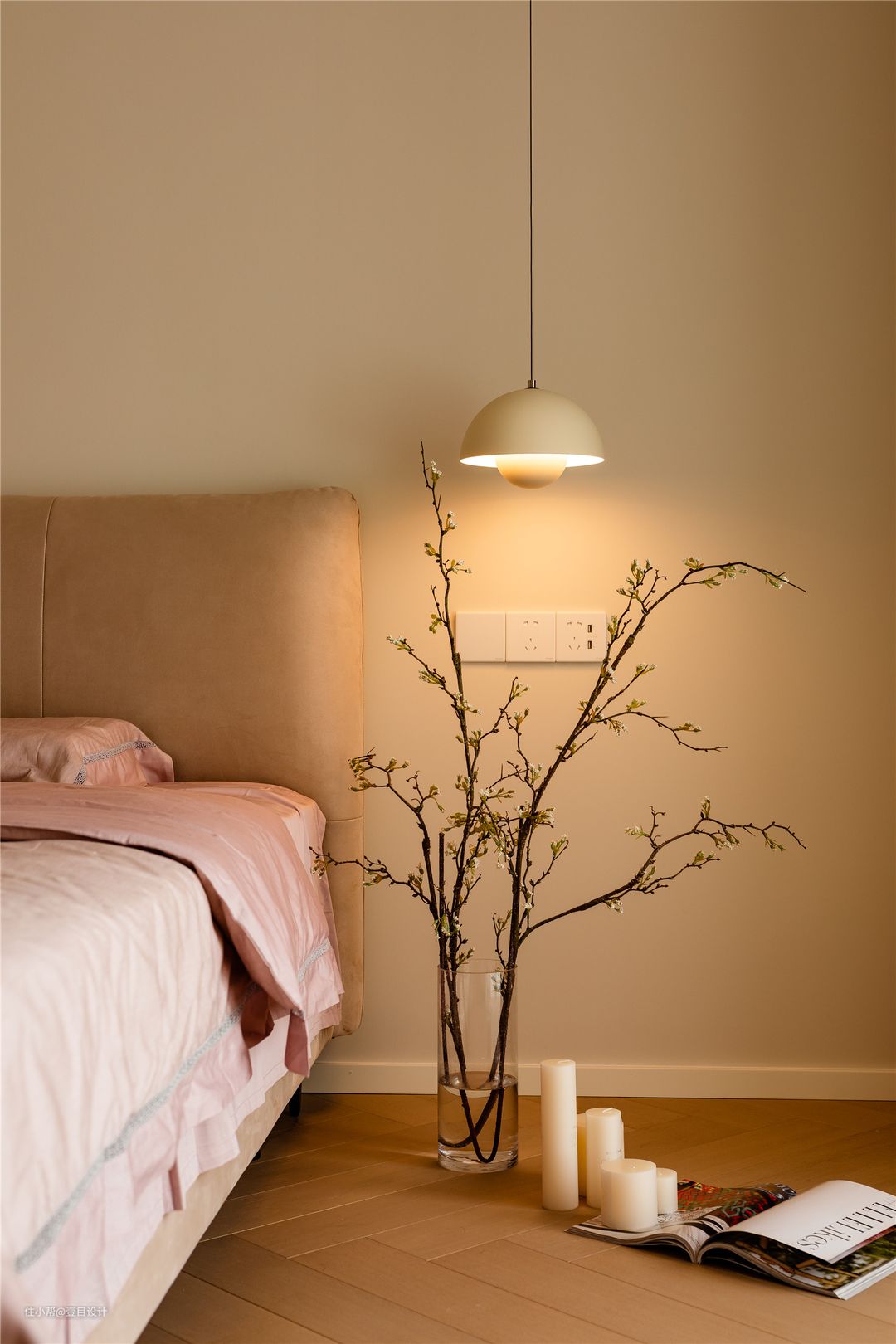 附带阳台的主卧采光充沛,空间沿袭了奶油色的设定,双人床也选择温暖的驼色,营造温馨的入眠氛围感。床头L型衣柜围合出小型的衣帽间,床尾则配置梳妆台,空间分工合理有序。一门到顶的白色高柜配以利落黑色拉手,降低了对床头的压迫感,又时尚有型。花苞灯以吊灯与壁灯两种形式,分列床头左右,引入柔和慵懒的光影氛围。