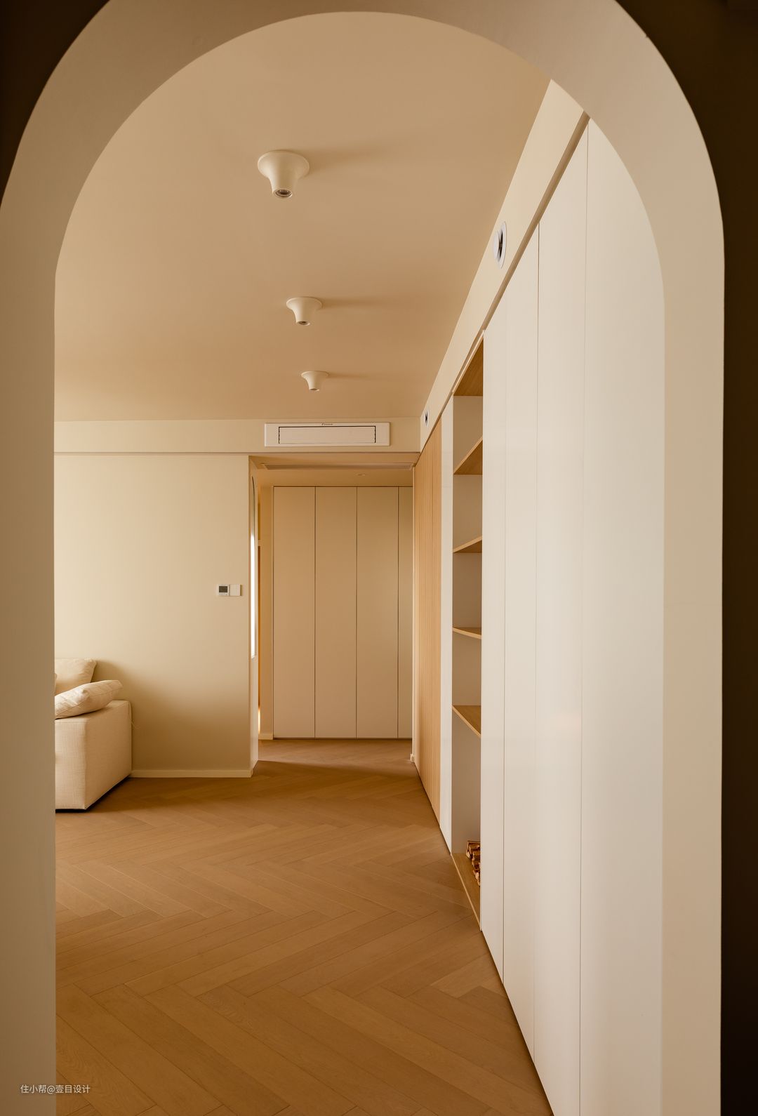 借用浪漫拱门衔接入户内外区域,玄关空间感得以扩大。伴随厨房开门方向的改变,零碎割裂的玄关重拾完整,归家仪式感渐浓。走廊满墙柜一字铺陈,观感统一流畅,闲置的廊道得以充分利用,成为小家的最强储备战力。 复合型的玄关柜,划分成鞋柜、换鞋凳和挂衣区三大功能模块,彼此互有分工,又在有限的空间内有所整合,全方面照顾入户后的一应需要,营造妥帖归家感受。