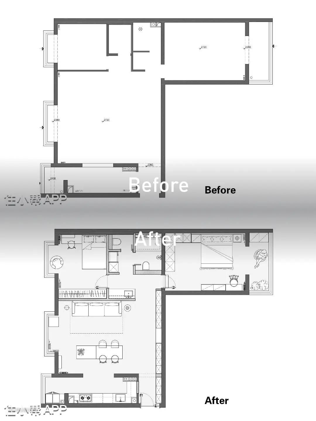 原房是不规则的手枪户两居室,过道闲置而浪费;玄关空间拥堵零碎;厨房狭长,采光不佳。主、次卫均为鸡肋窄小的暗卫,利用率低下。