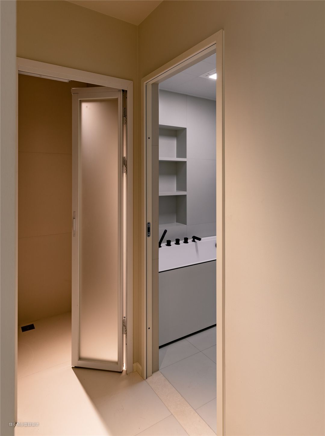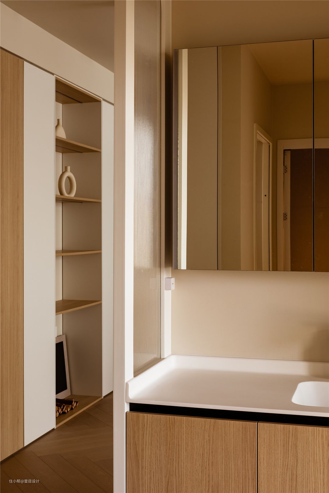 双卫合并为独卫后,洗手台挪至与主卧床尾同侧的过道,将干湿区彻底分离,提高使用效率与舒适感。干区台面延长设计,实现洗漱与卸妆功能合一,减少不必要的走动距离。清透长虹玻璃与半墙结合,确保洗漱区域的私密感之余,又加强了干区与廊道的联动。大容量的镜柜配合悬空浴室柜,足以应对卫浴的不同收纳需要,维持空间的整洁感。