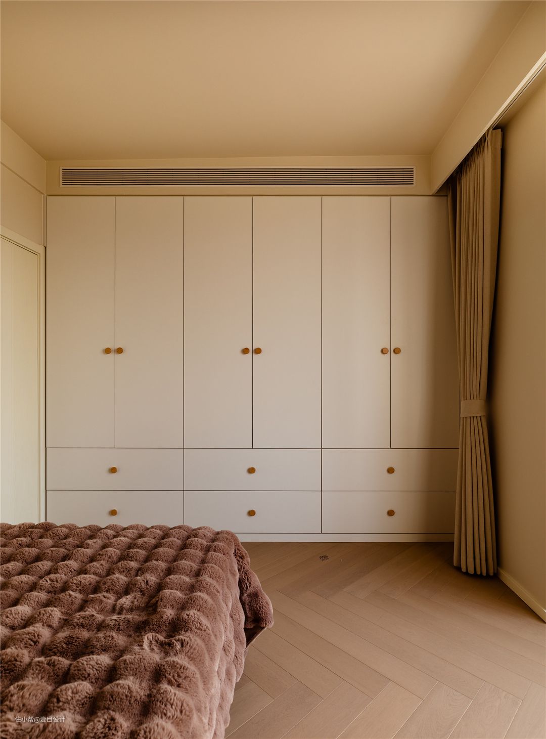 公区是日常活动开展的主场,屋主期待的是一个宽敞、自由的空间。以纵向排列的一体客餐厅为中心,向四周发散,将飘窗融入其中,感受尺度拓展带来的最大舒适感。米色艺术漆与木色人字拼互为彰显,渲染出自然治愈的氛围感。 摈弃的杂糅繁复的吊顶设计,留足层高的呼吸感,有别于传统的无主灯设计,天花采用预埋式椎体石膏射灯照明,与满屏的弧形元素,形成一种和谐的呼应。