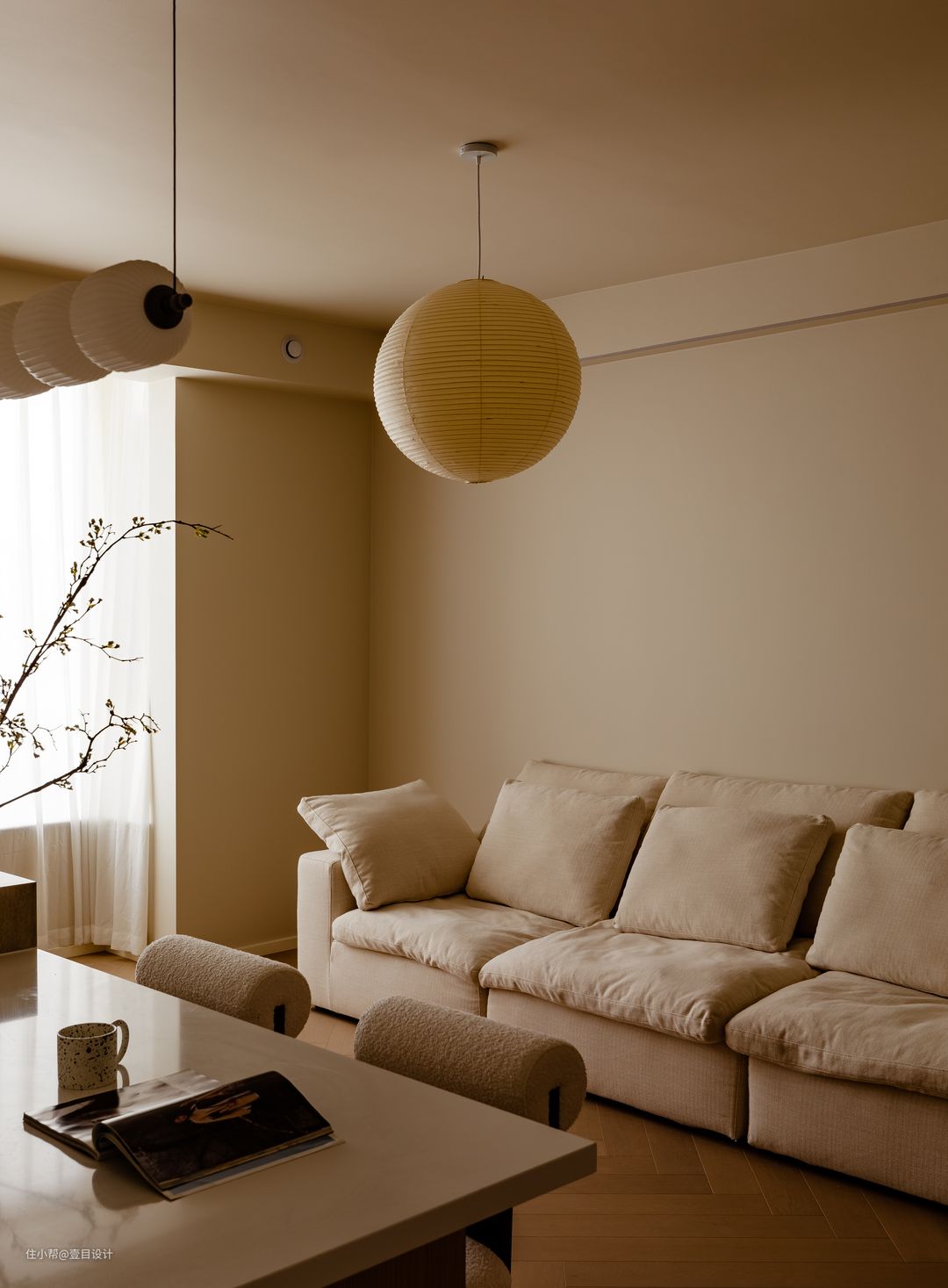 一改以电视为中心的常规布局,客厅追求更自由随性的生活表达方式,米色模块沙发成为为数不多的家具软装,引入一丝柔软舒适的触感,更多的空间让渡于日常活动的展开,拒绝形式主义,转而关注居者的真实需求。
