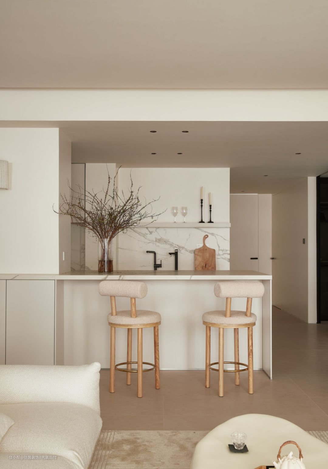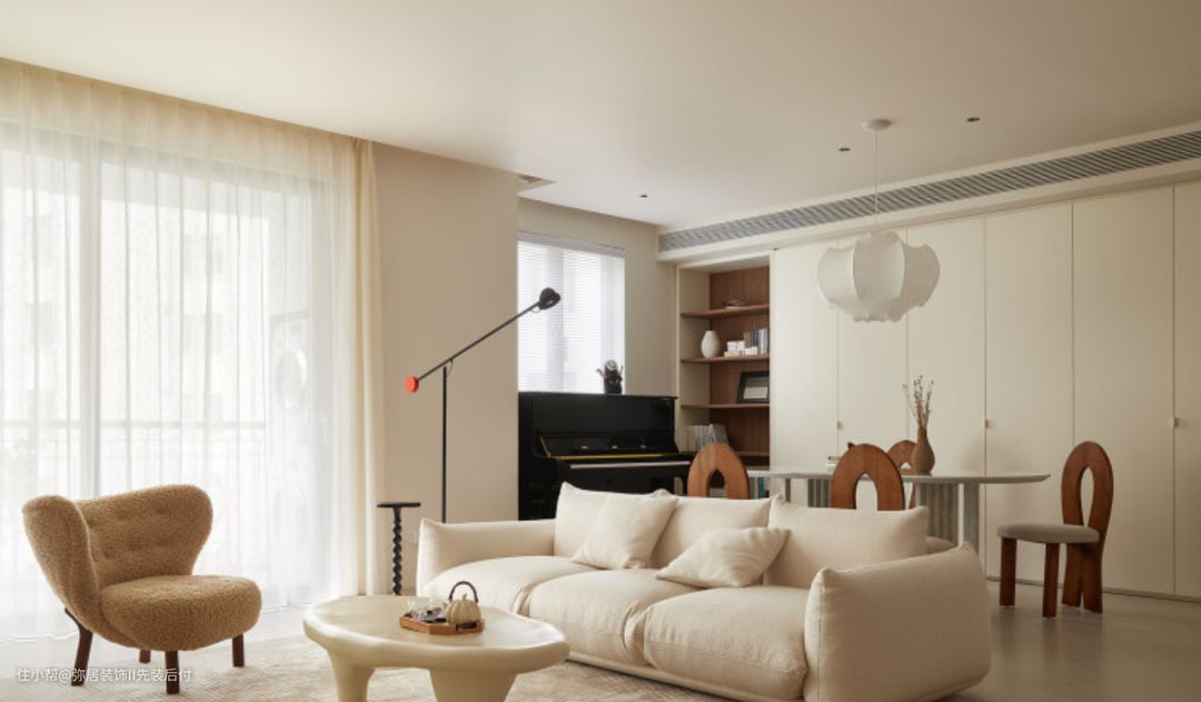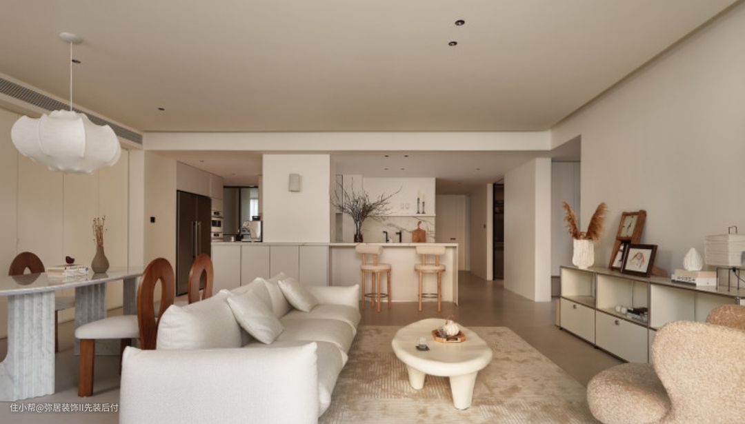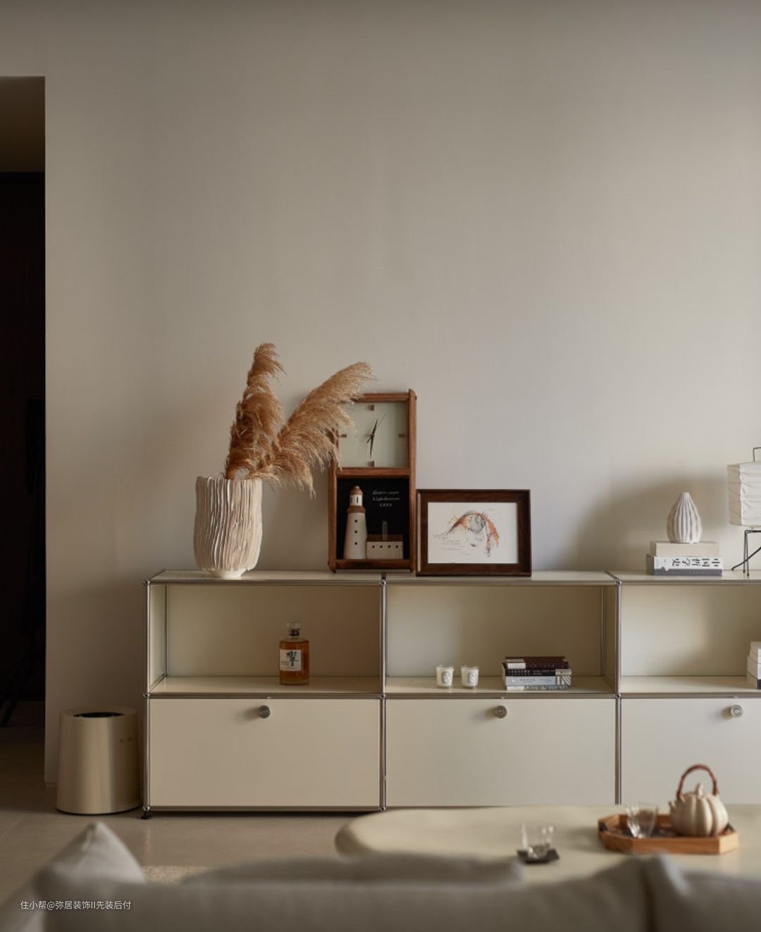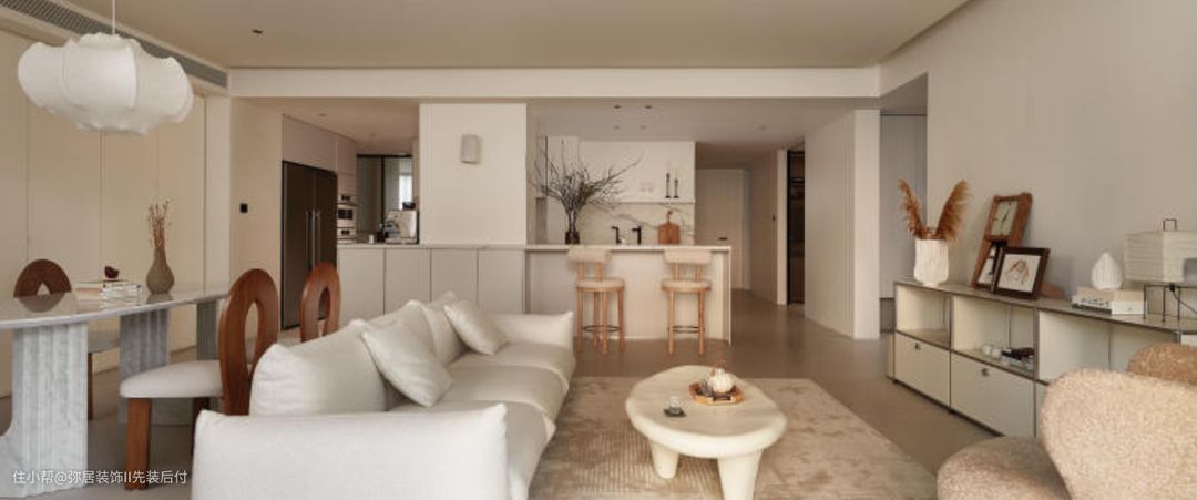 风格定位是现代轻法式,有点小优雅,更多的是温馨柔美。整体的色调非常和谐, 温温柔柔的奶茶色系,一回到家就瞬间感到放松,真的有被这个家治愈到。