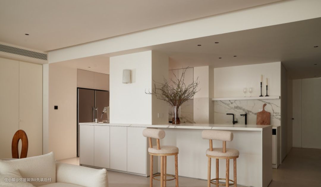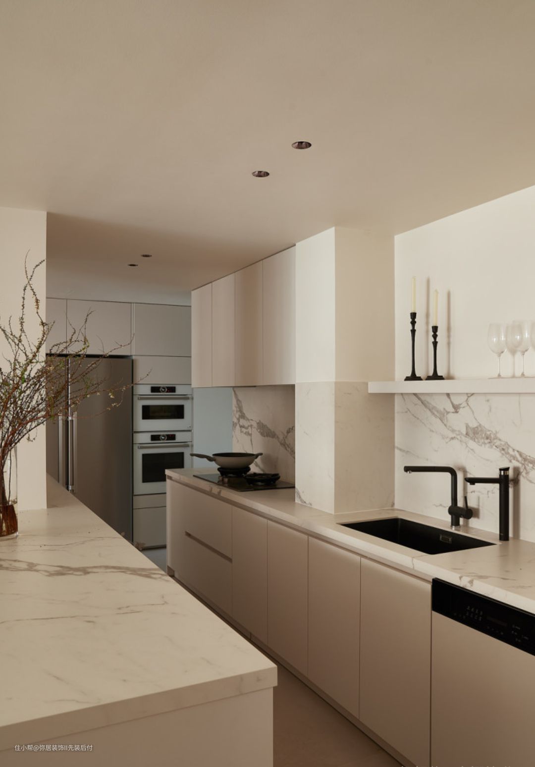 这个拆不掉的承重柱,都无比顺眼,灶台正好躲在 后面,视线也有个遮挡。两个台面平行设计,形成一个大的洄游动线,非常的灵动 方便,操作空间也很宽敞,让做饭不再是一个人的独舞,而是全家都能参与或陪 伴。