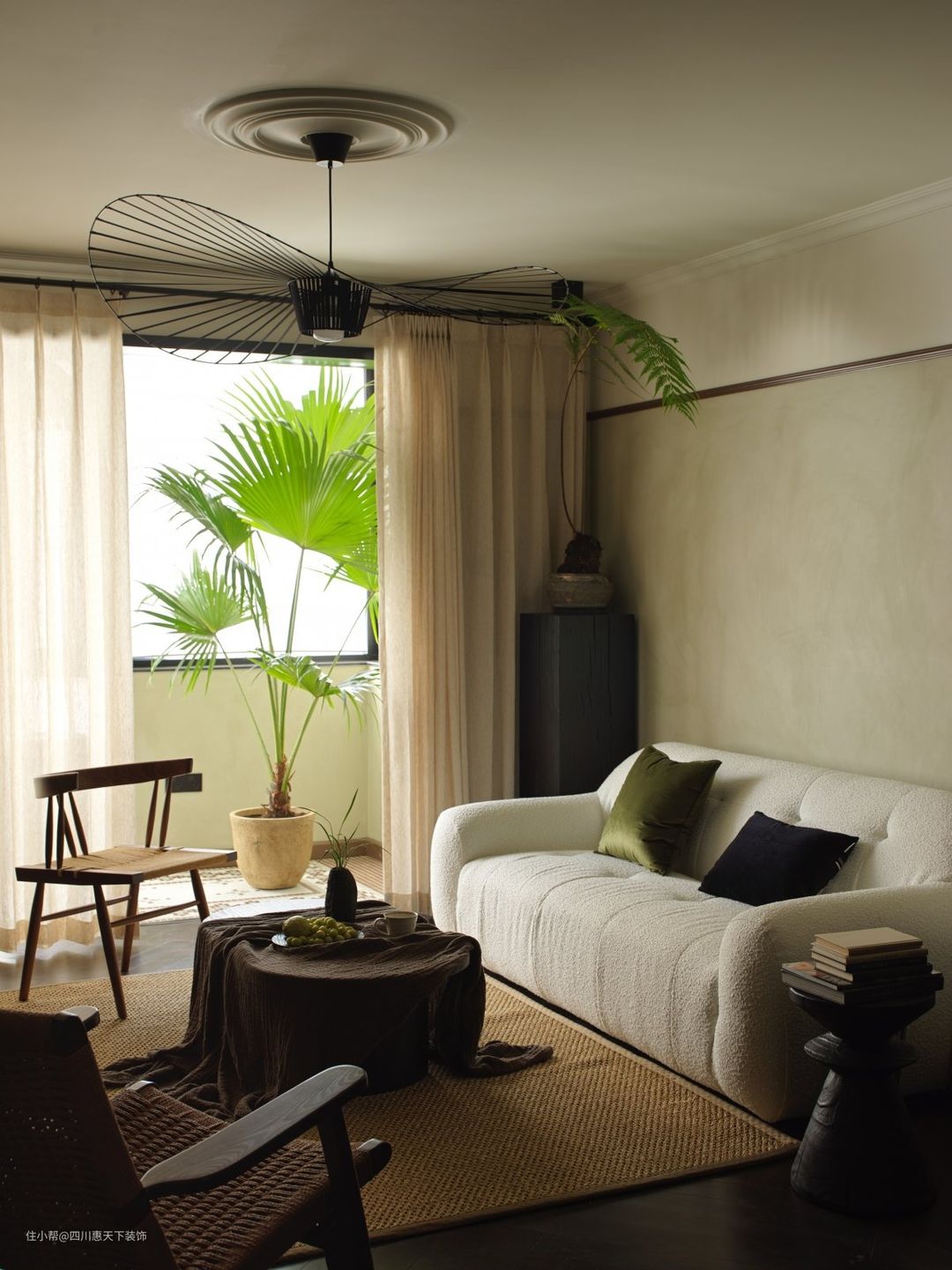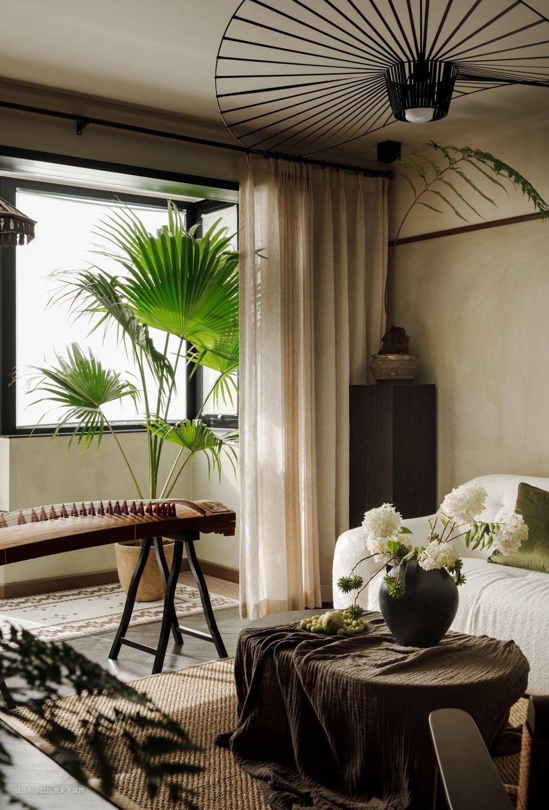 屋主是一对九零后年轻夫妇,对生活很有自己的想法,希望自己的家独特又鲜活。东南亚热带季风气候特有的潮湿质地,清爽浓郁的色彩,余韵悠长的岁月感非常吸引屋主,他们喜欢自然元素,明确想要南洋复古风。结合屋主性格和喜好,打造了一个专属于他们的家,空间整体灰绿色加深棕色调结合,低饱和色调赋予空间沉静气息,除去南洋复古元素,还柔和了一些东方风格在内,例如最点睛的电视墙屏风,部分中古风软装配饰。空间扑面而来的生命力,自带故事感的氛围,像极了一部老电影。将不同元素融合在一起,一个独有的,有灵魂的空间诞生。