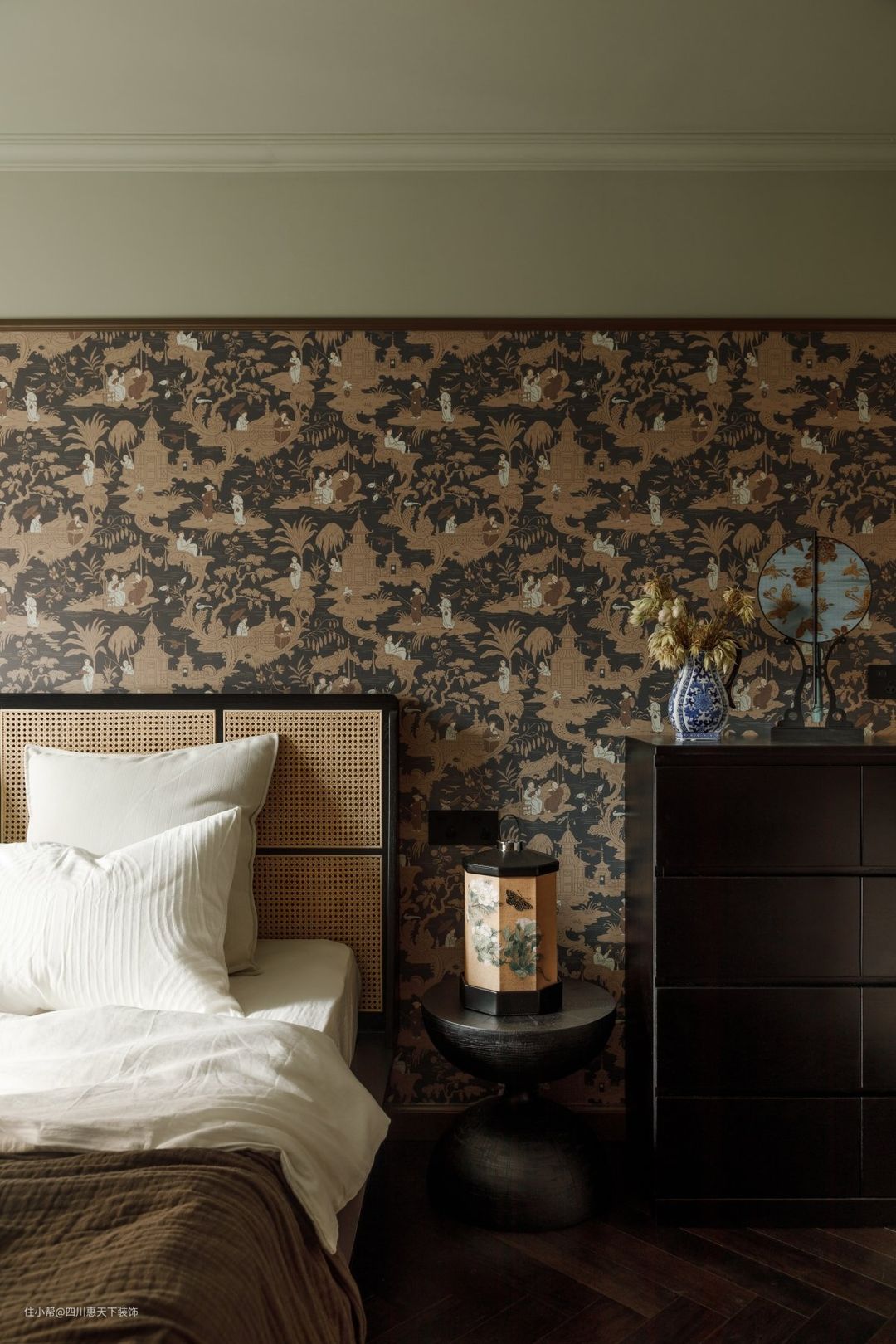 壁纸加藤编床头元素组合,藤编材质独具自然质朴感。壁纸同样选用了东方元素,卧室采光充足,顶面选用了灰绿色乳胶漆,深色壁纸在乳胶漆的叠加下更能彰显质感。借用一部分次卧面积后给到了主卧衣帽柜体,这组接近五米的柜子满足了大量的收纳。侧墙选用国风人物画,为空间增加了一丝艺术气息。