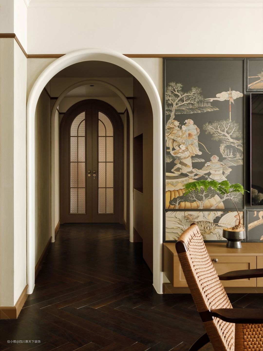 将原本鸡肋的走廊延伸后增加了两处弧形门洞设计,连续的弧形让走廊充满延伸感,走廊尽头书房弧形门造型十分复古。右侧柜体借用了一部分卧室面积,用来收纳家政杂物,中间镂空的部分是后期给家里两只小鸟夜间休息使用,最下方镂空初是给到扫地机器人,原本无利用率的区域得以很好的利用。很喜欢这个视角,像电影画面。