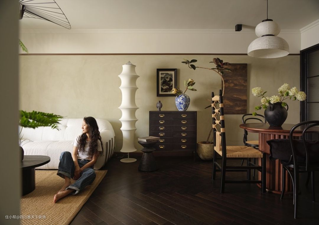 餐边柜用于收纳的同时也与客厅有了联动。在造型选择上特意选了一款黑色木纹黄铜拉手的柜子,黑木纹与黄铜对比碰撞为空间增加质感。青花瓷花器让南洋风意境更足。 餐厅是兼顾烟火气与文艺氛围的空间。圆形餐桌比方形餐桌更聚气,圆润无边角,不容易磕碰也更节省空间。屋主二人大多数时间也都是两人在家用餐,比起方桌更适合。为圆餐桌搭配了四把不同的中古风格餐椅,纸质吊灯与空间很协调,氛围感十足。