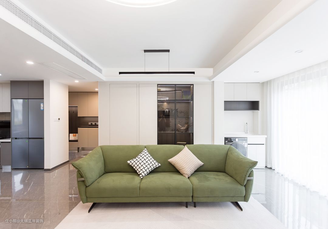 那张舒适沙发的色调与庭院的绿色形成了完美的呼应,仿佛是室内空间对户外自然的一种延续和呼应。沙发上的面料柔软而光滑,触感如同夏日的微风,坐在沙发上,看着窗外的绿色景致,仿佛能感受到大自然的力量和生命的活力。