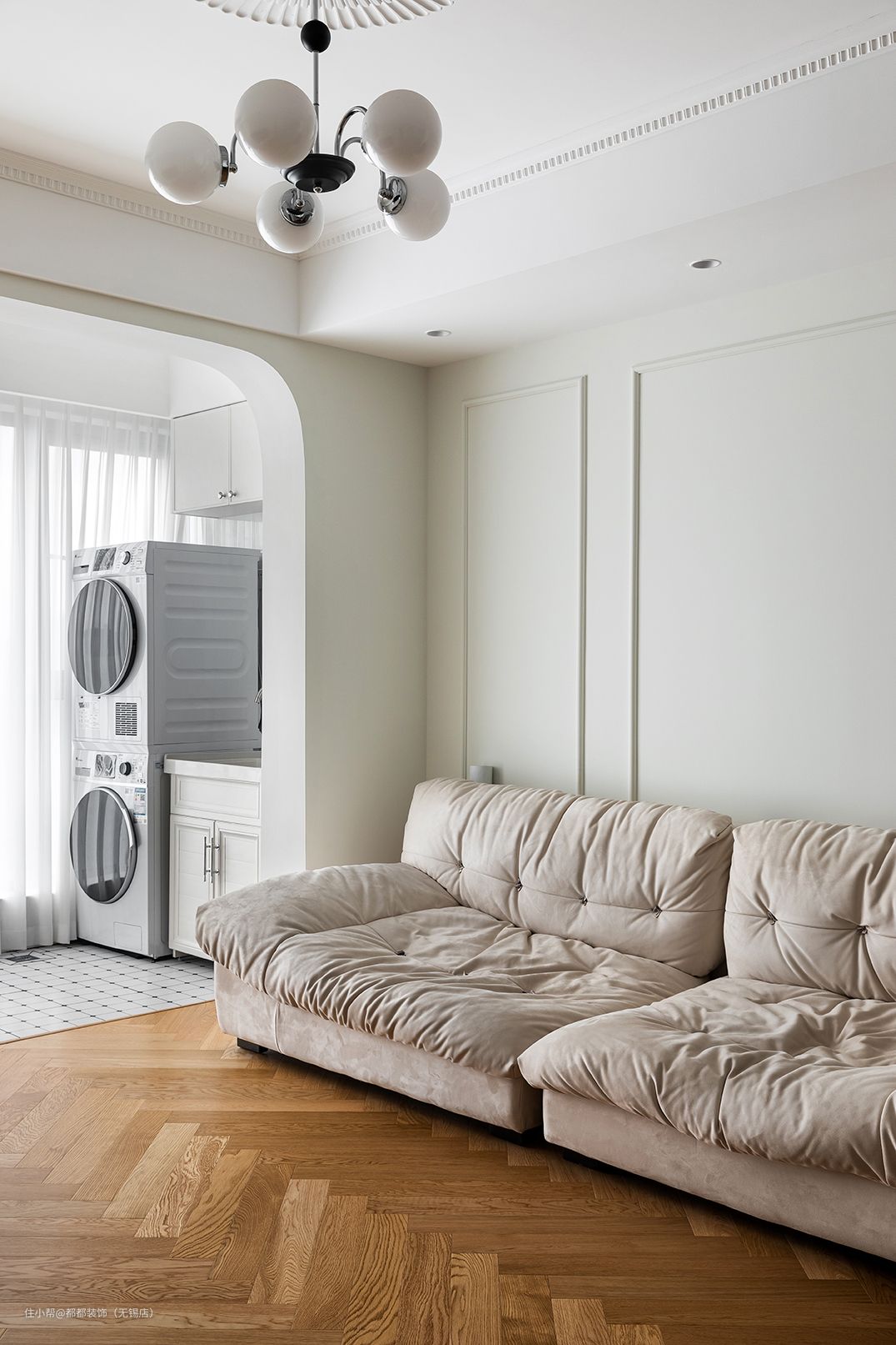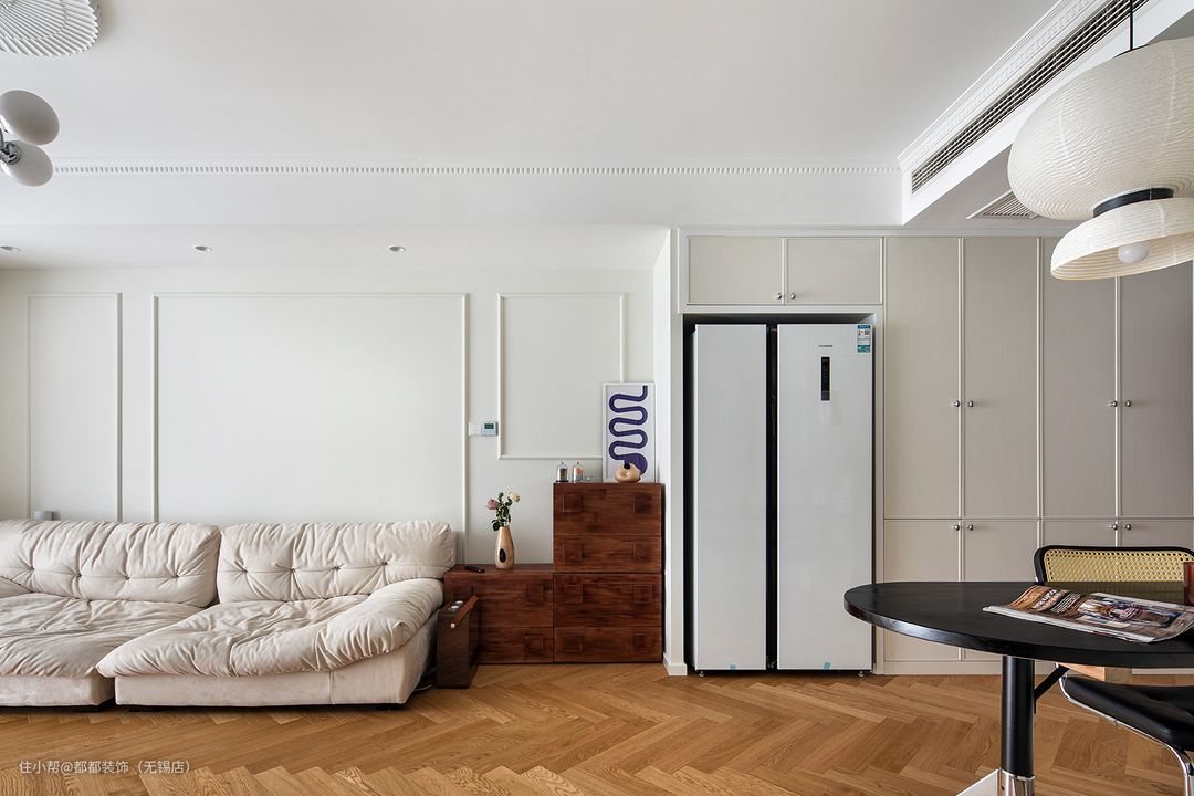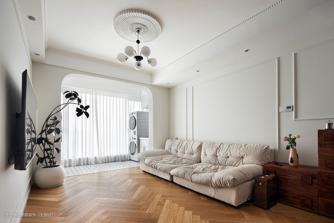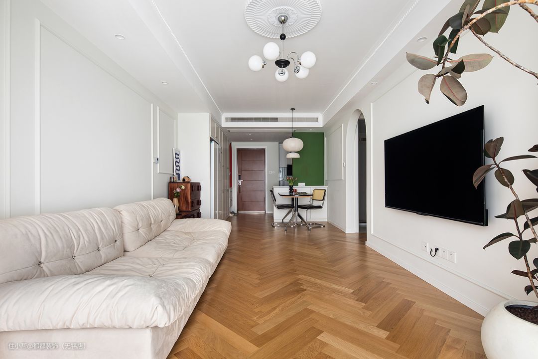 柔美的线条和精致的装饰,轻柔的奶油白与焦糖色人字拼成为空间的基础色调。背景保留空白,并以极简的石膏线条和立体雕花作为装饰。电视背景墙纯净洁白,搭配走廊的弧形拱门设计,曲线与直线之间完美地呼应了简约之美。 奶茶色的沙发与复古气息浓郁的榛果色收纳柜相互搭配,洋溢出满满的慵懒气息。整体空间融合了原木、绿植等元素,搭配墙面雕花的石膏线,整个空间舒适惬意、干脆利落。