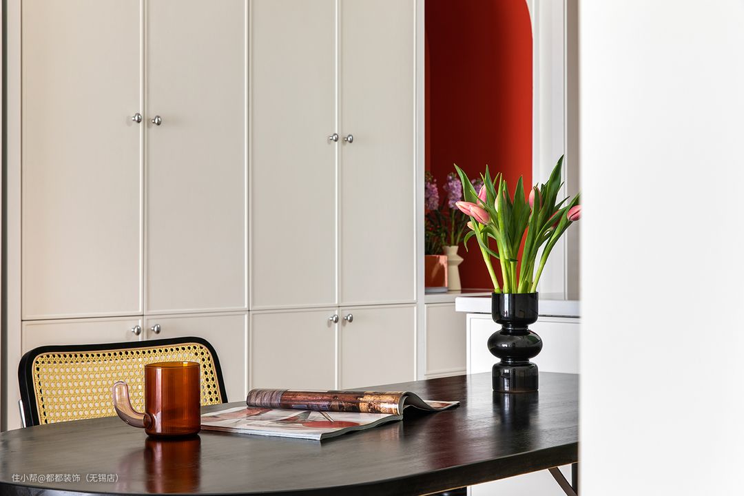 奶油色的明暗差异、材质与肌理的相互碰撞与融合,塑造出极具层次感的艺术氛围。墙面抹茶绿的精妙运用,打破了素色调传统的配色观念,大胆且直观地营造出舒缓优美的感觉,将法式的浪漫展现到了极致。 餐桌并未选用大体量的款式,而是以黑色半圆原木桌取而代之,其轻便易移动,搭配两套藤编餐椅,日常使用更为方便,同时也使空间显得更为轻盈、通透。
