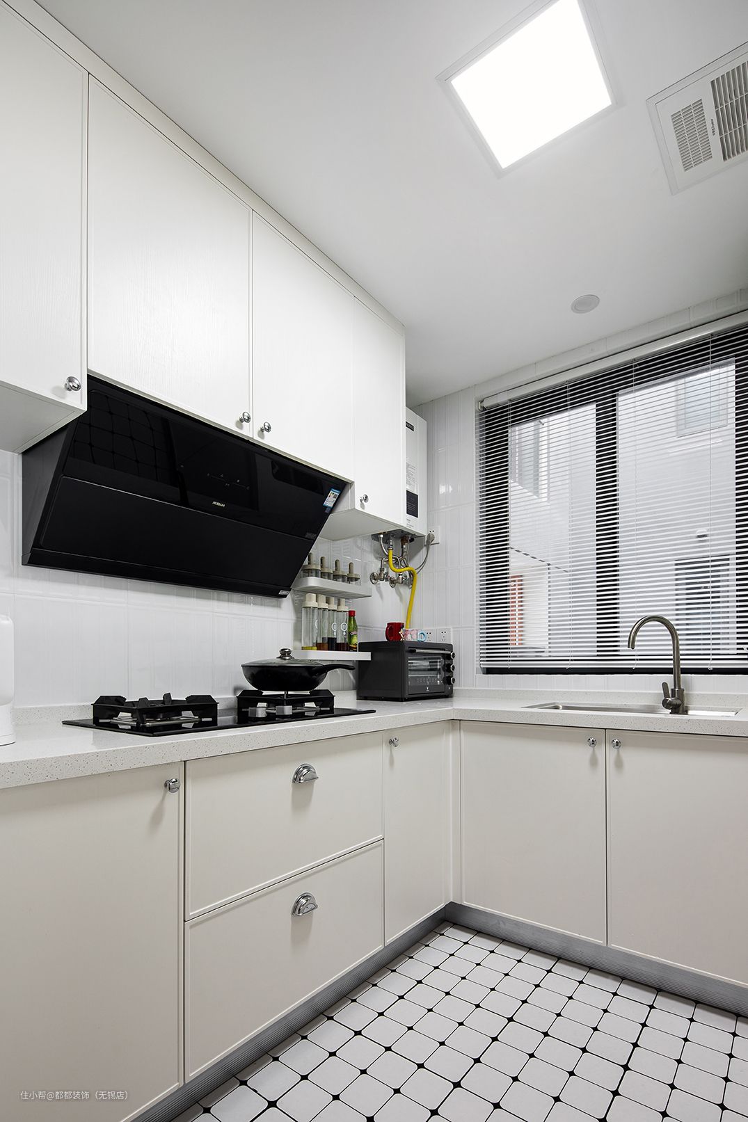 厨房采用 U 形设计,视野开阔,一览无余,显得清爽澄净,营造出雅致的空间韵律。白色的橱柜与客厅的整体色系相互呼应,实现了恰到好处的平衡。厨房应有的小电器一应俱全,方便日常切洗果蔬或是制作简单的餐食。排水管处的墙面同样装饰了同款抹茶绿,能够有效缓解视觉疲劳,令人感到十分自愈。