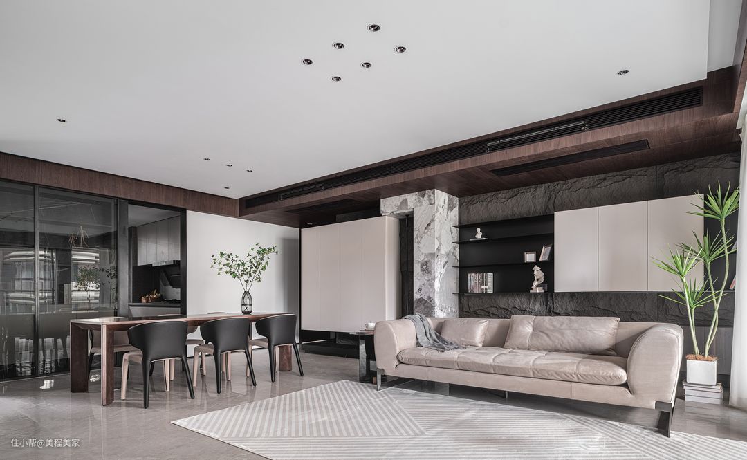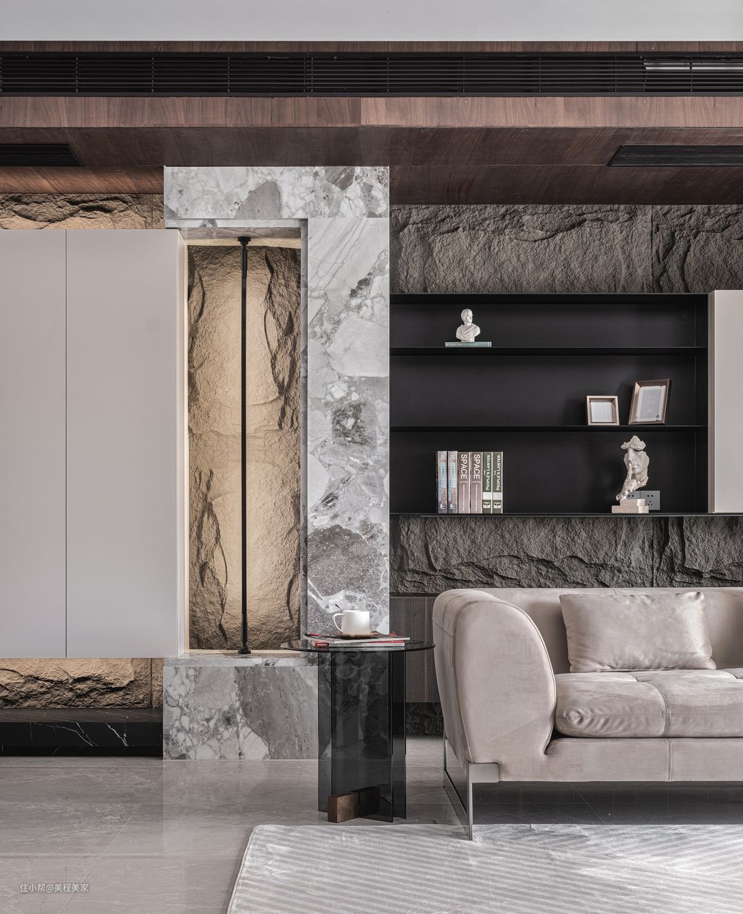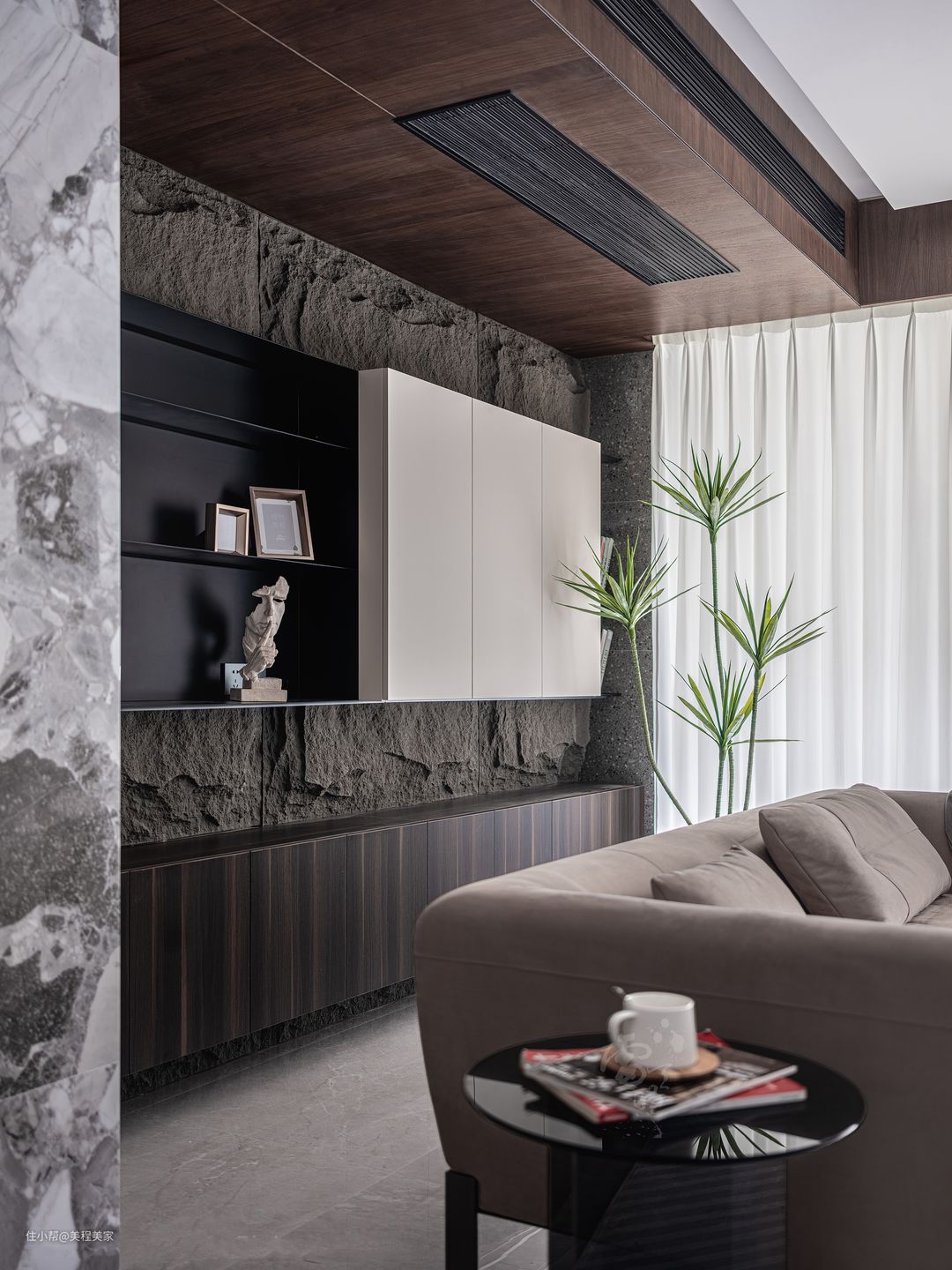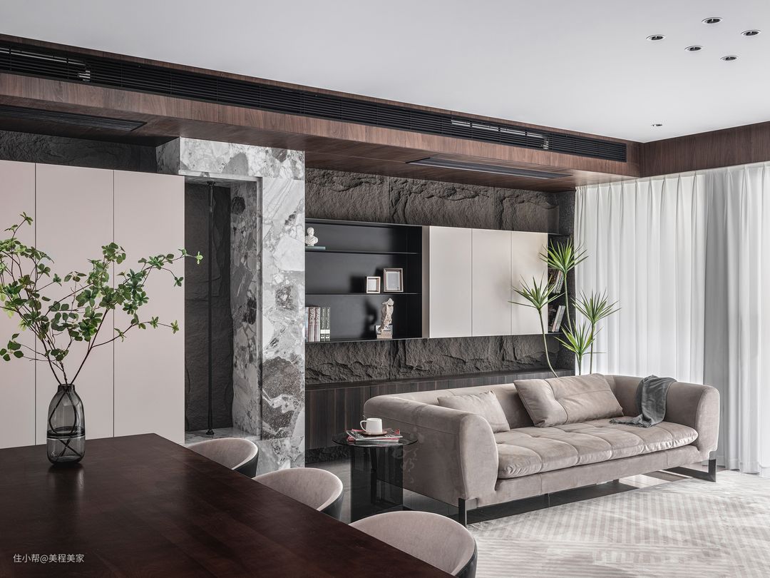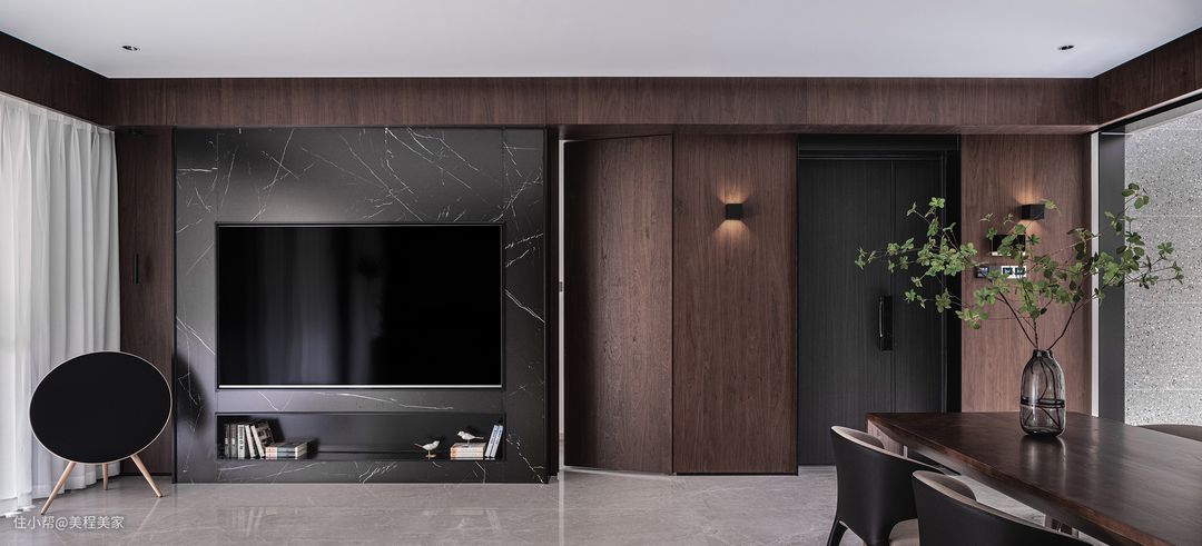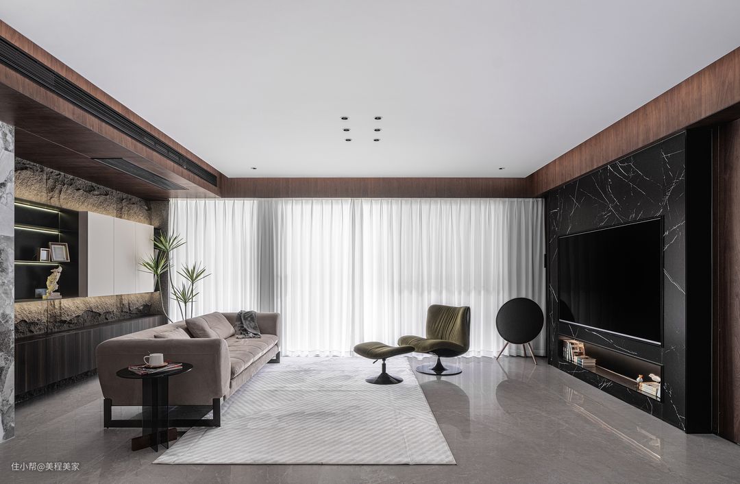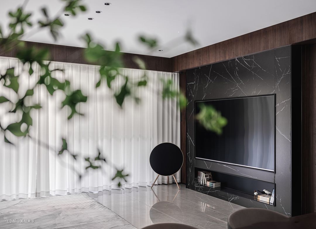 客厅电视墙的设计更是别出心裁,大面积的黑色背景与墙面上的大理石纹理形成了强烈的对比,让一台黑色的大屏幕平板电视显得更加突出,电视仿佛是客厅中的另一位主角,静静地等待着夜幕降临,为居住者带来丰富多彩的视听享受。 墙面的大理石纹理装饰则为整个空间增添了一份高贵与典雅。这些纹理如同自然界的杰作,既有着细腻的触感,又透露出一种不凡的气质。它们与灰色的瓷砖地板相得益彰,共同营造出一个既整洁又富有层次感的居住环境。 在房间的一侧,白色的窗帘轻轻垂落,它们随风轻摆,仿佛在低语着外界的喧嚣与宁静。透过窗帘的缝隙,可以隐约看到外面的光线洒落进来,为客厅增添了一抹温馨与明亮。这光线与室内的灯光交织在一起,形成了一种柔和而舒适的氛围,让人不禁想要在这个空间中停留更久一些。