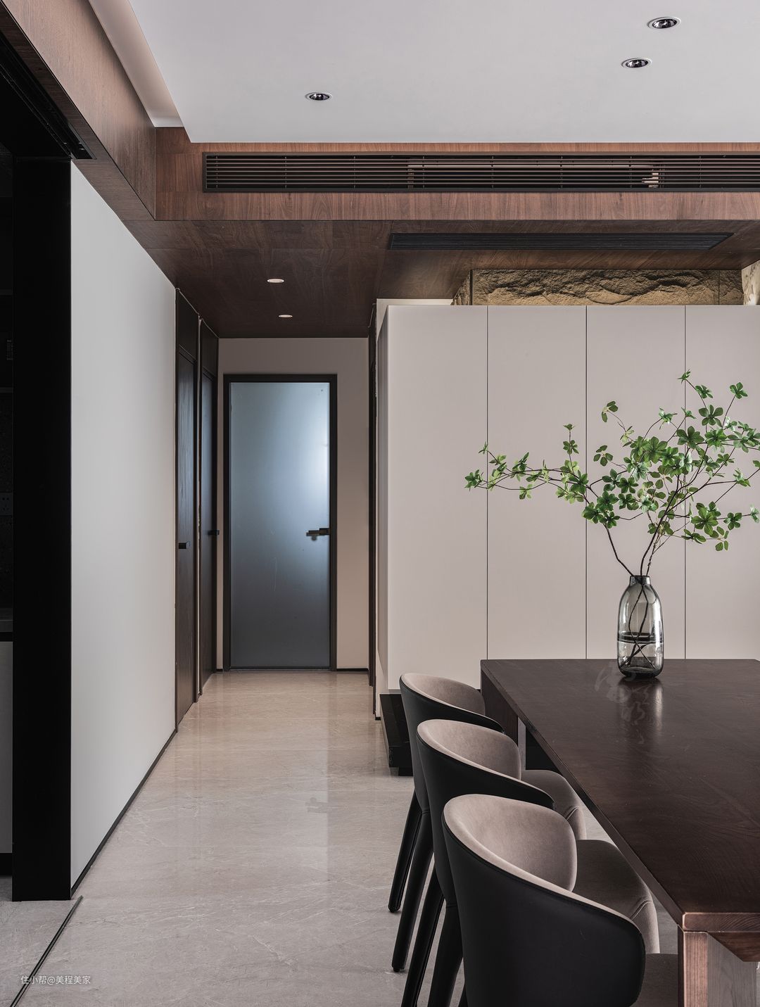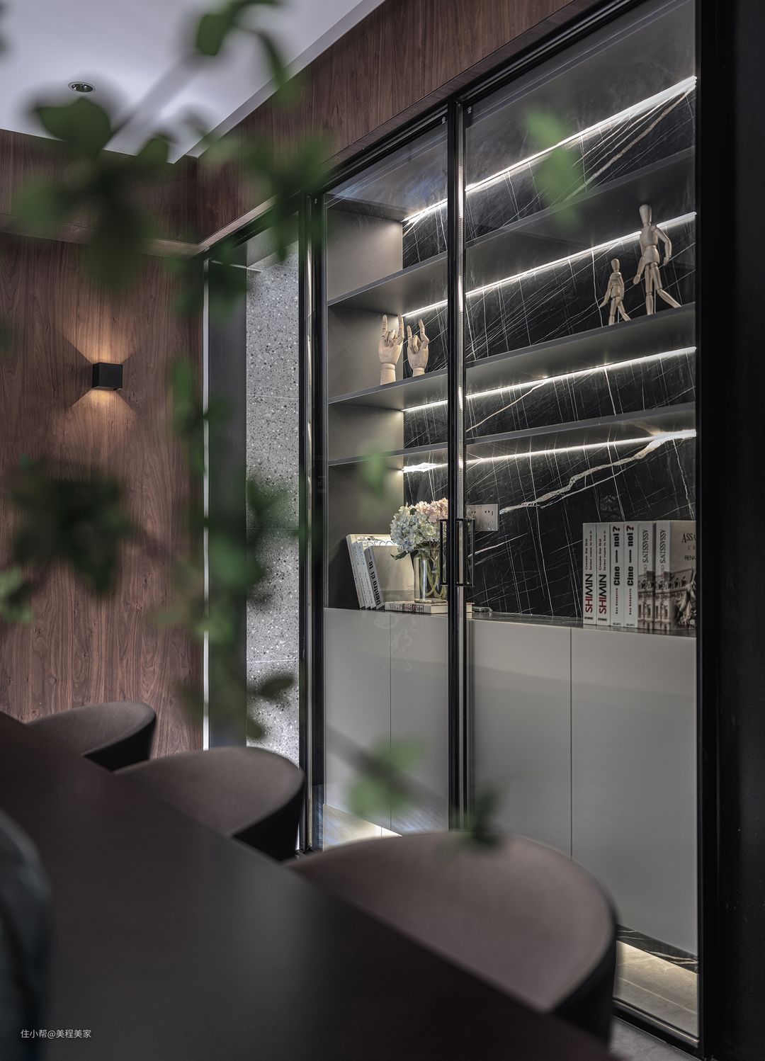 餐厅里,每一处细节都散发着简约而不失格调的魅力。餐厅中央,一张长方形木质餐桌静静地伫立着,它的表面平滑如镜,没有过多的装饰,只是等待着即将上桌的美食来点缀。这张餐桌的木质纹理清晰可见,透露着自然与质朴的气息,与整个餐厅的现代氛围形成了微妙的平衡。 整个餐厅的氛围宁静而和谐,空气中弥漫着一种淡淡的清新气息。在这样的环境中用餐,无疑会是一种享受。无论是与家人共度温馨时光,还是与朋友畅谈人生理想,这里都是一个理想的选择。